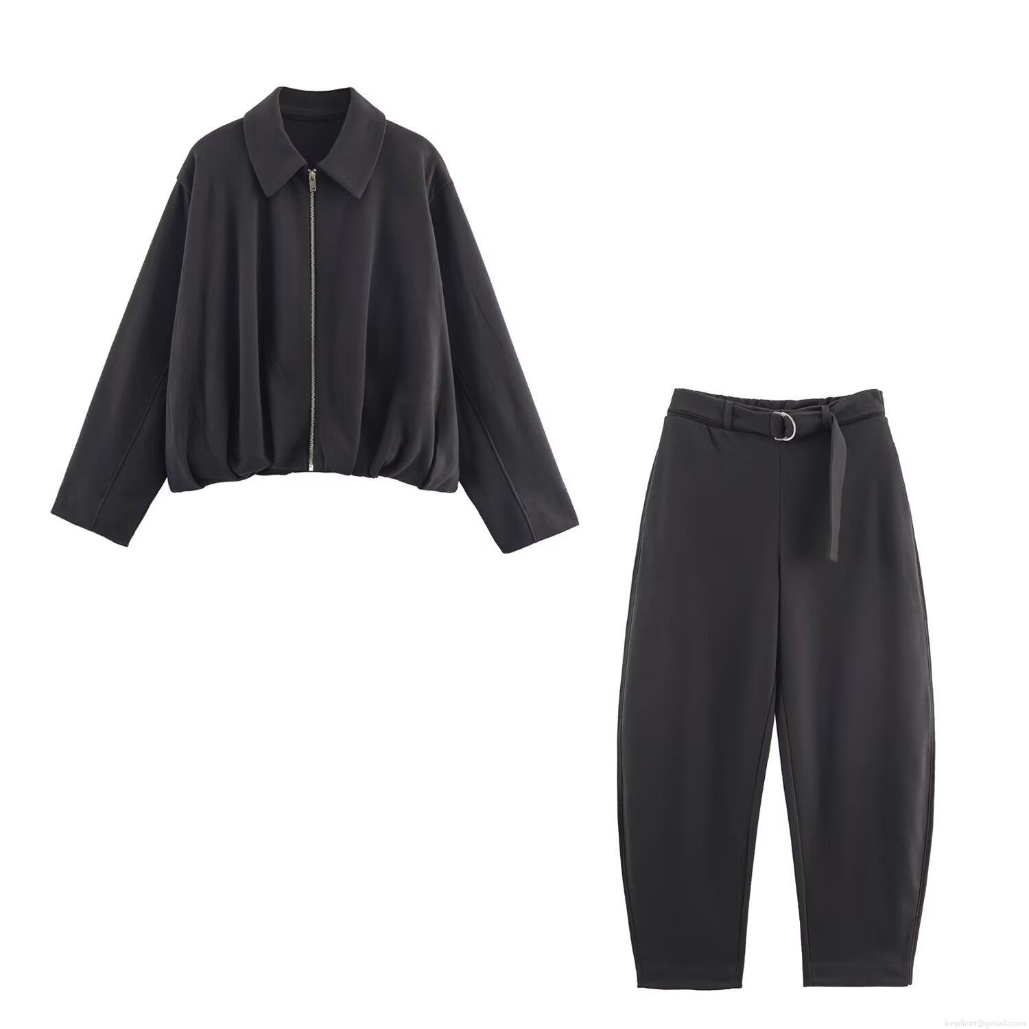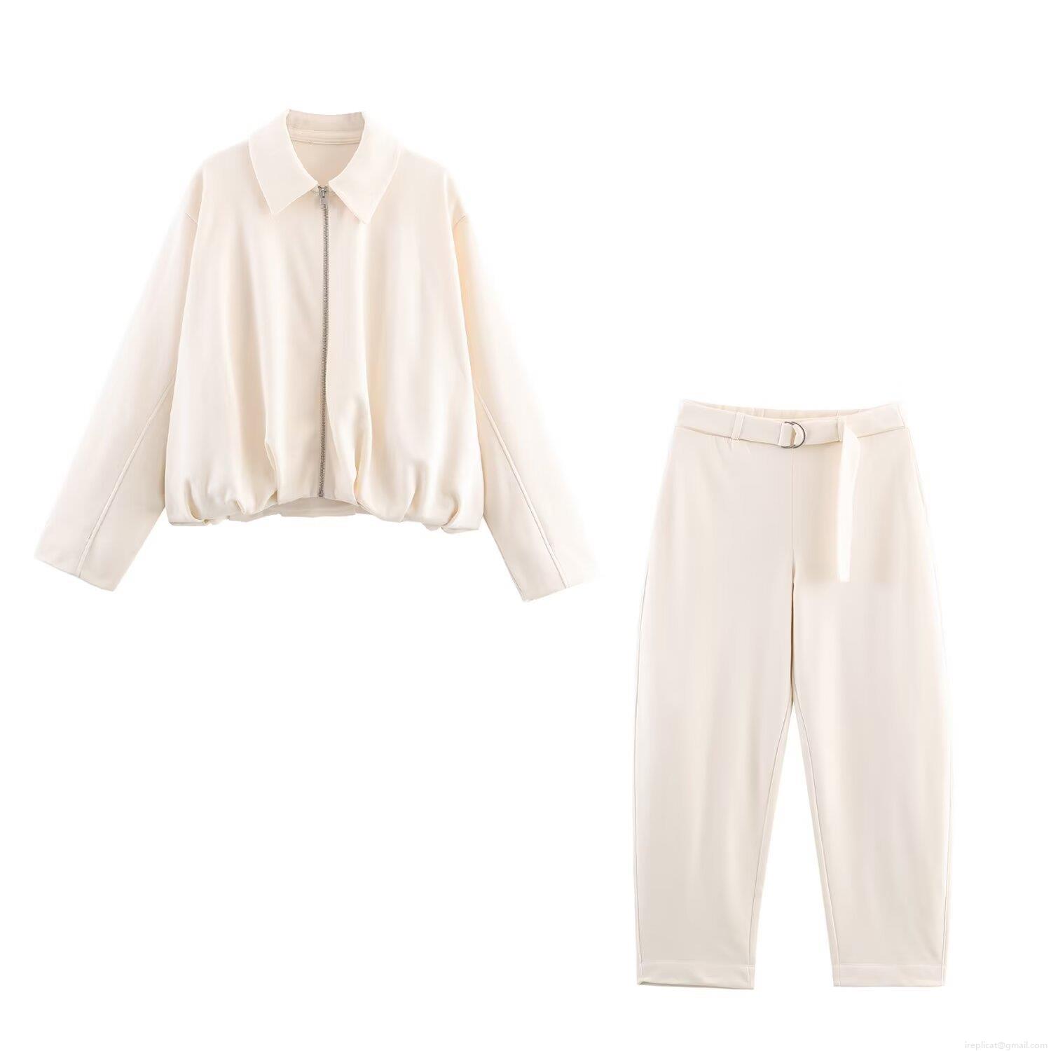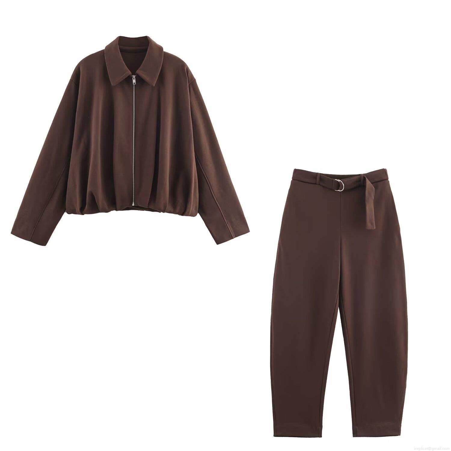 • Women's 2 Piece Knit Outfit Sets Full Zip Bomber Jacket and High Waist Pants with Belt Autumn Winter Casual Streetwear Ladies Solid Color Co-ord Set
