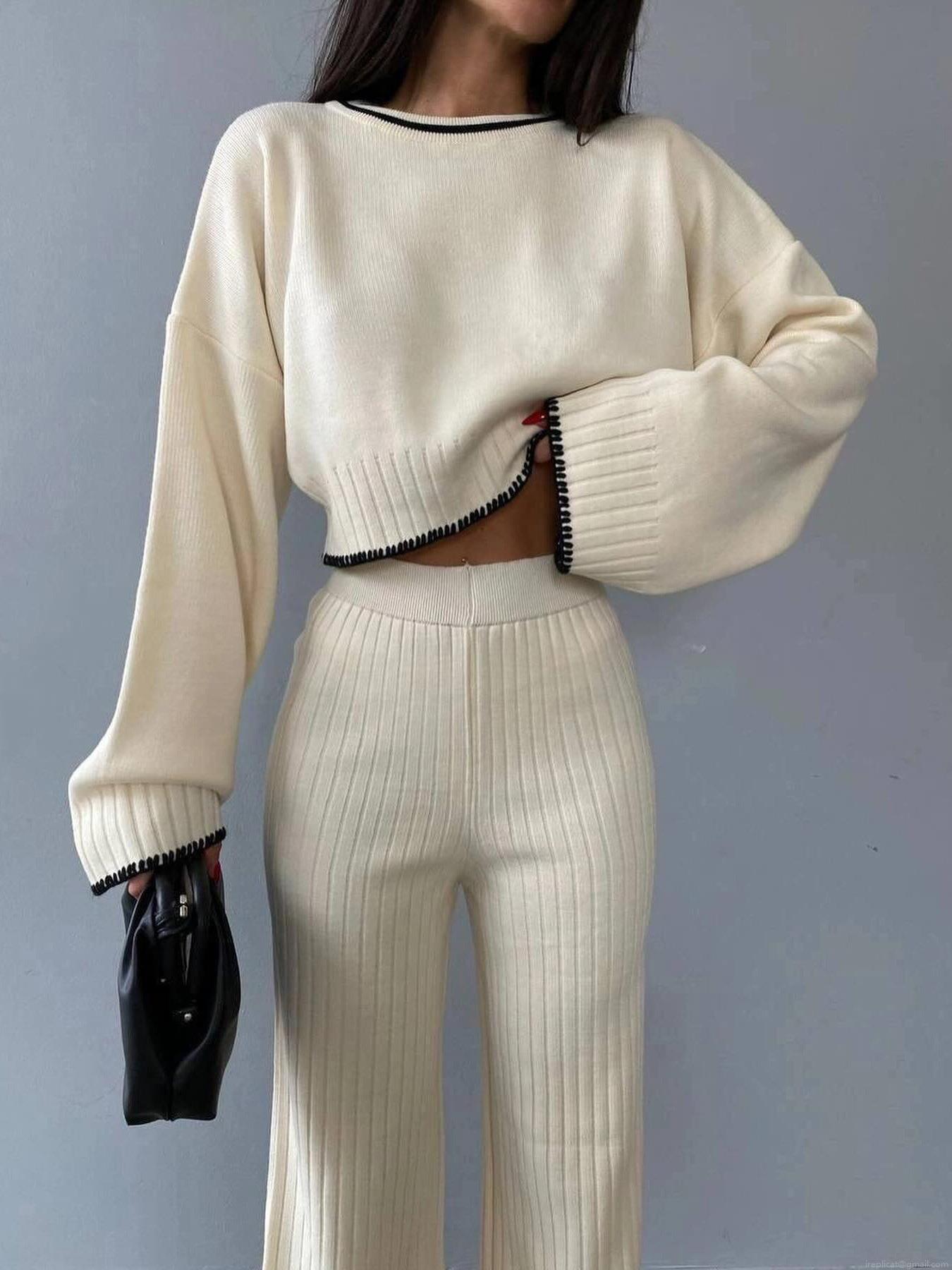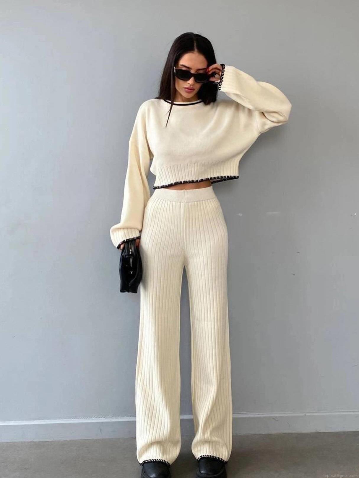 • Women's 2 Piece Knit Outfits Contrast Trim Long Sleeve Crop Top And High Waisted Wide Leg Pants Set Elegant Cotton Blend Lounge Sweatsuit