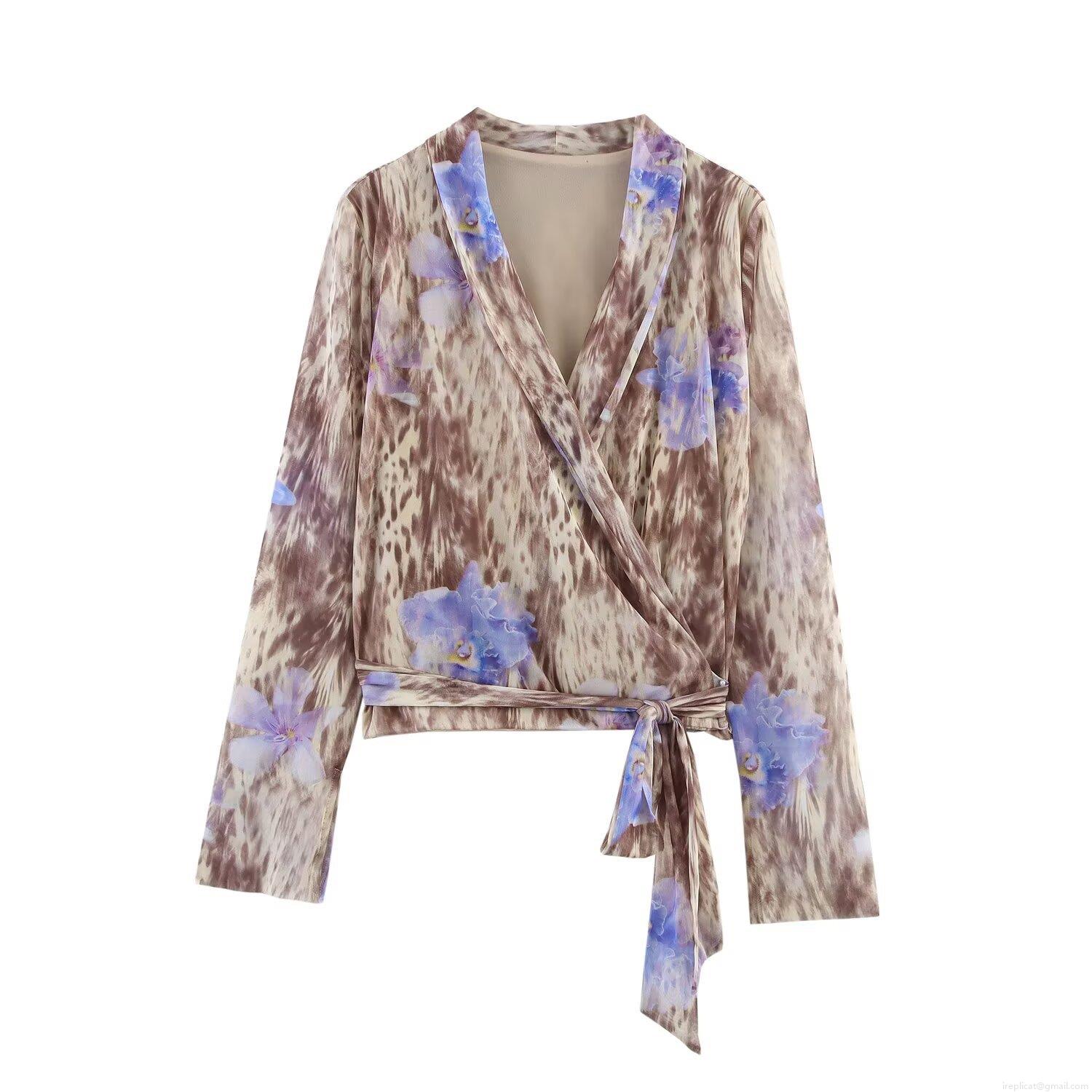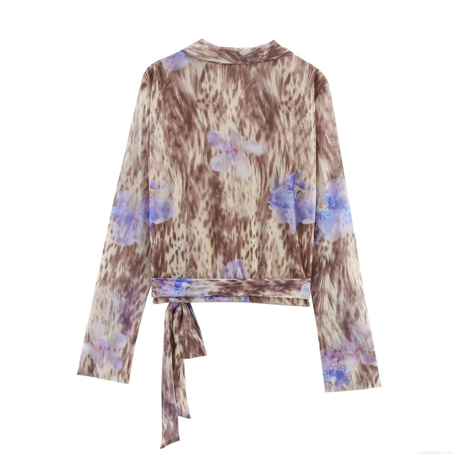 • Women's 2 Piece Mesh Set Leopard Floral Print Long Sleeve Wrap Tie Front Top and Wide Leg Pants Casual Streetwear Fashion Outfit