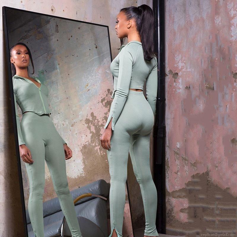 • Women's 2 Piece Ribbed Outfits Sexy Long Sleeve Half Zip Up Crop Top and High Waist Skinny Slit Pants Sets Solid Color Streetwear Tracksuits