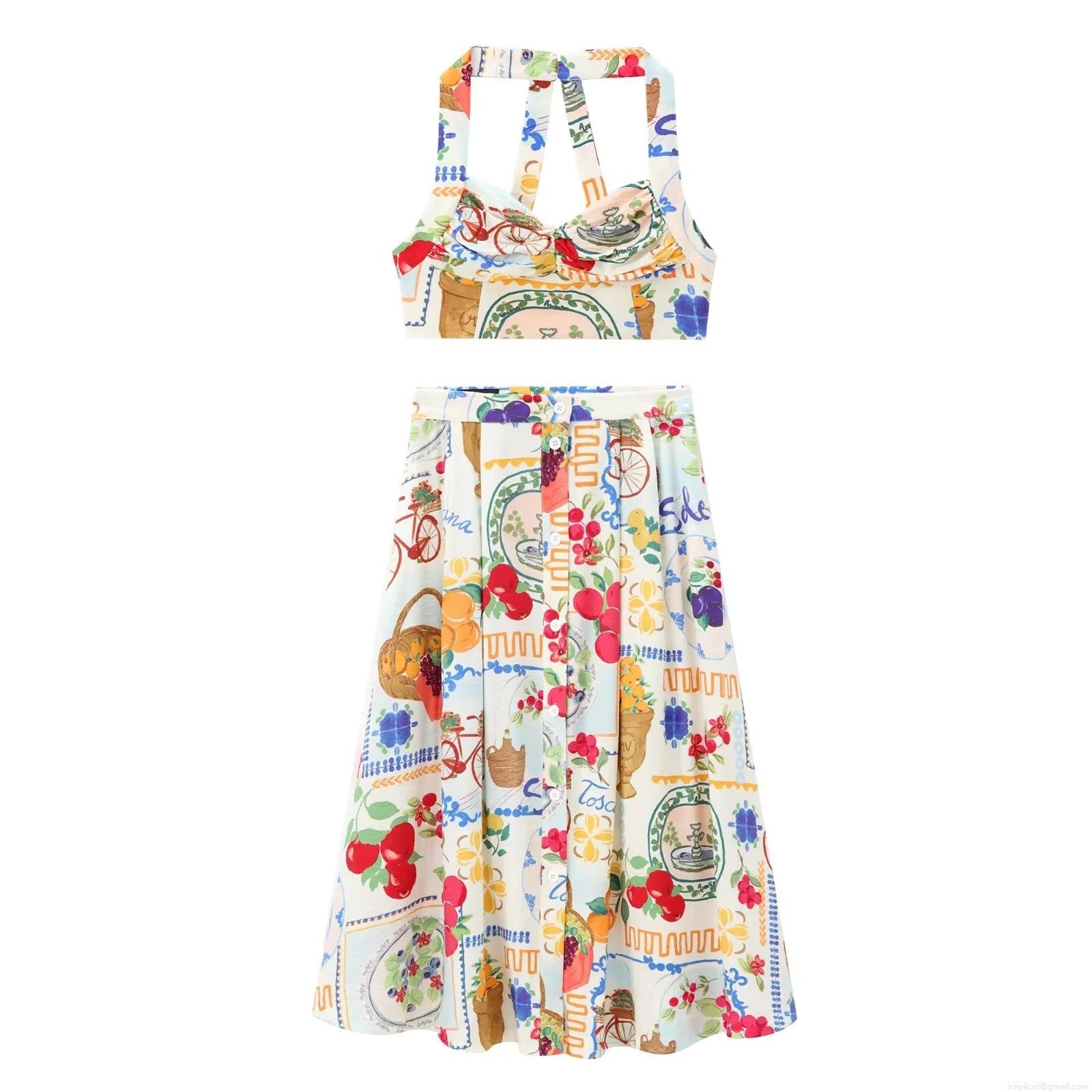 Women's 2 Piece Set Mediterranean Fruit Print Halter Crop Top and High Waist Button A-Line Midi Skirt Polyester Vacation Summer Beach Outfit