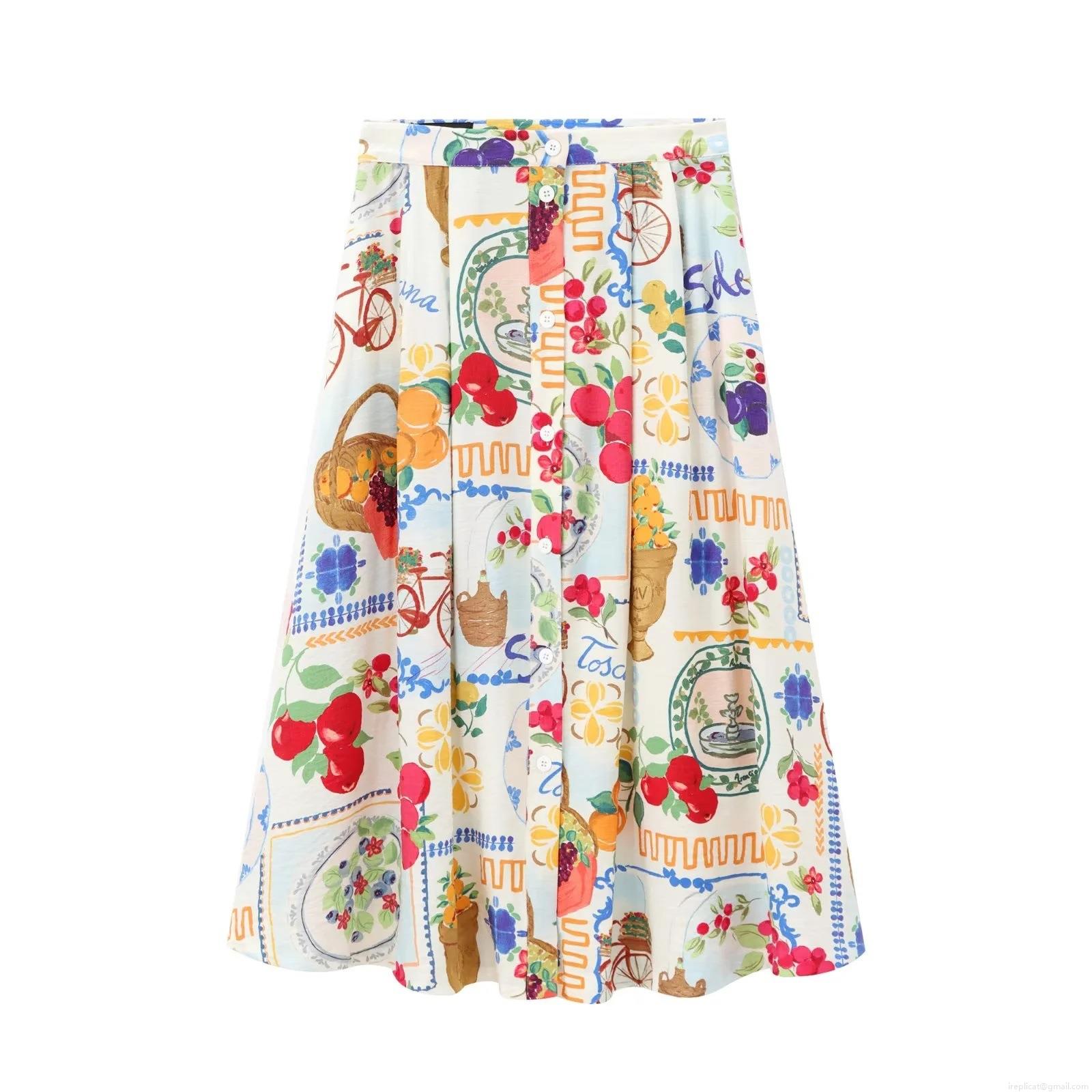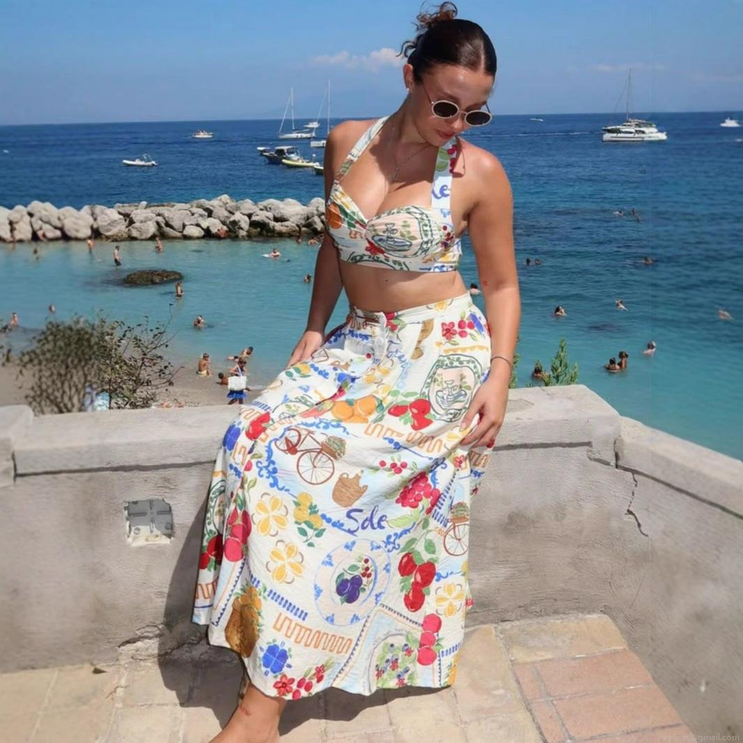 • Women's 2 Piece Set Mediterranean Fruit Print Halter Crop Top and High Waist Button A-Line Midi Skirt Polyester Vacation Summer Beach Outfit
