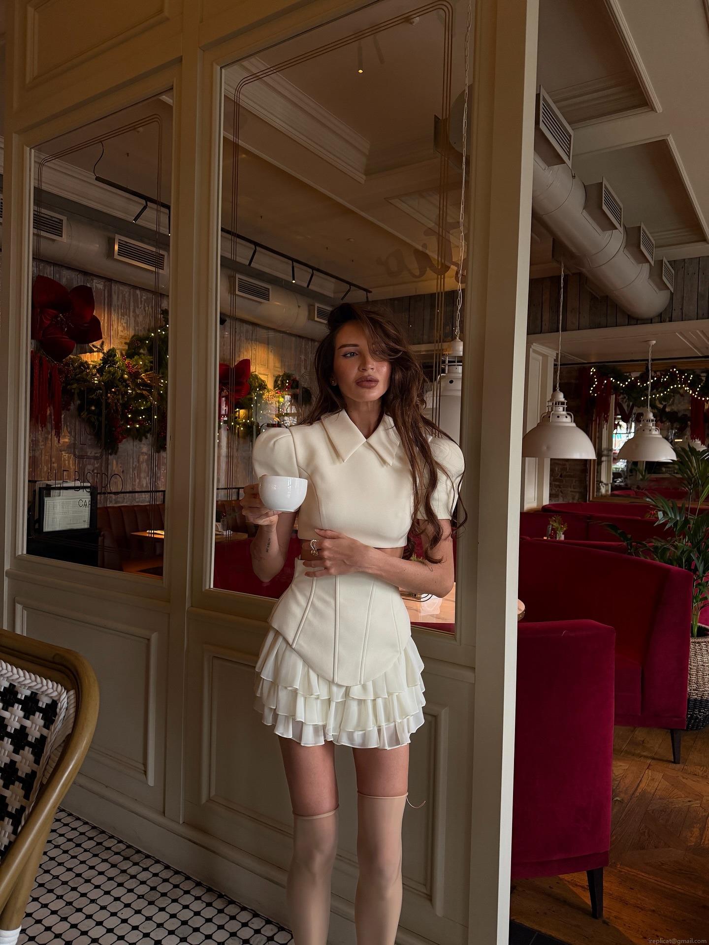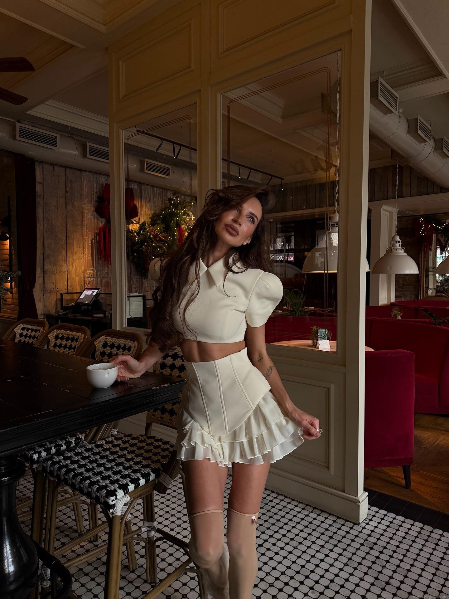 • Women's 2 Piece Skirt Set Creamy White Puff Short Sleeve Lapel Crop Top And Layered Ruffle High Waist Mini Skirt Elegant Sexy Summer Streetwear Outfit