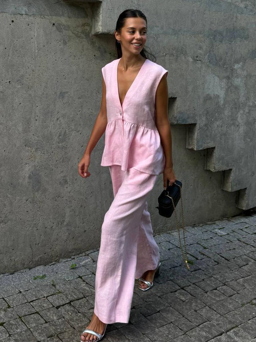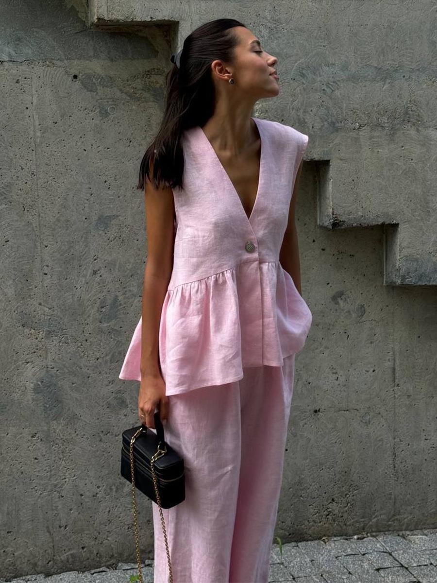 • Women's 2 Piece Summer Outfits Sleeveless V Neck Ruffle Hem Top And High Waist Wide Leg Pants Set Solid Color Casual Elegant Tracksuit For Women Vacation Beach Wear