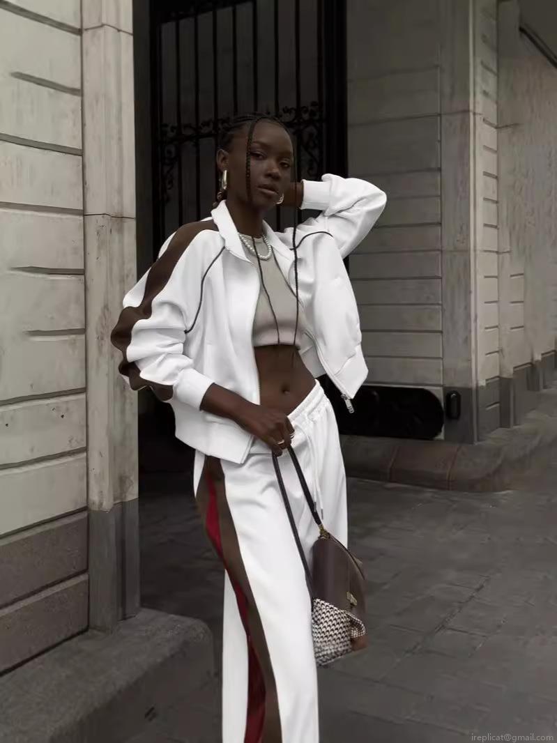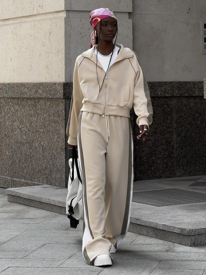 • Women's 2 Piece Sweatsuit Set Striped Cotton Blend Zip Up Stand Collar Jacket and High Waist Wide Leg Sports Pants Streetwear Tracksuit