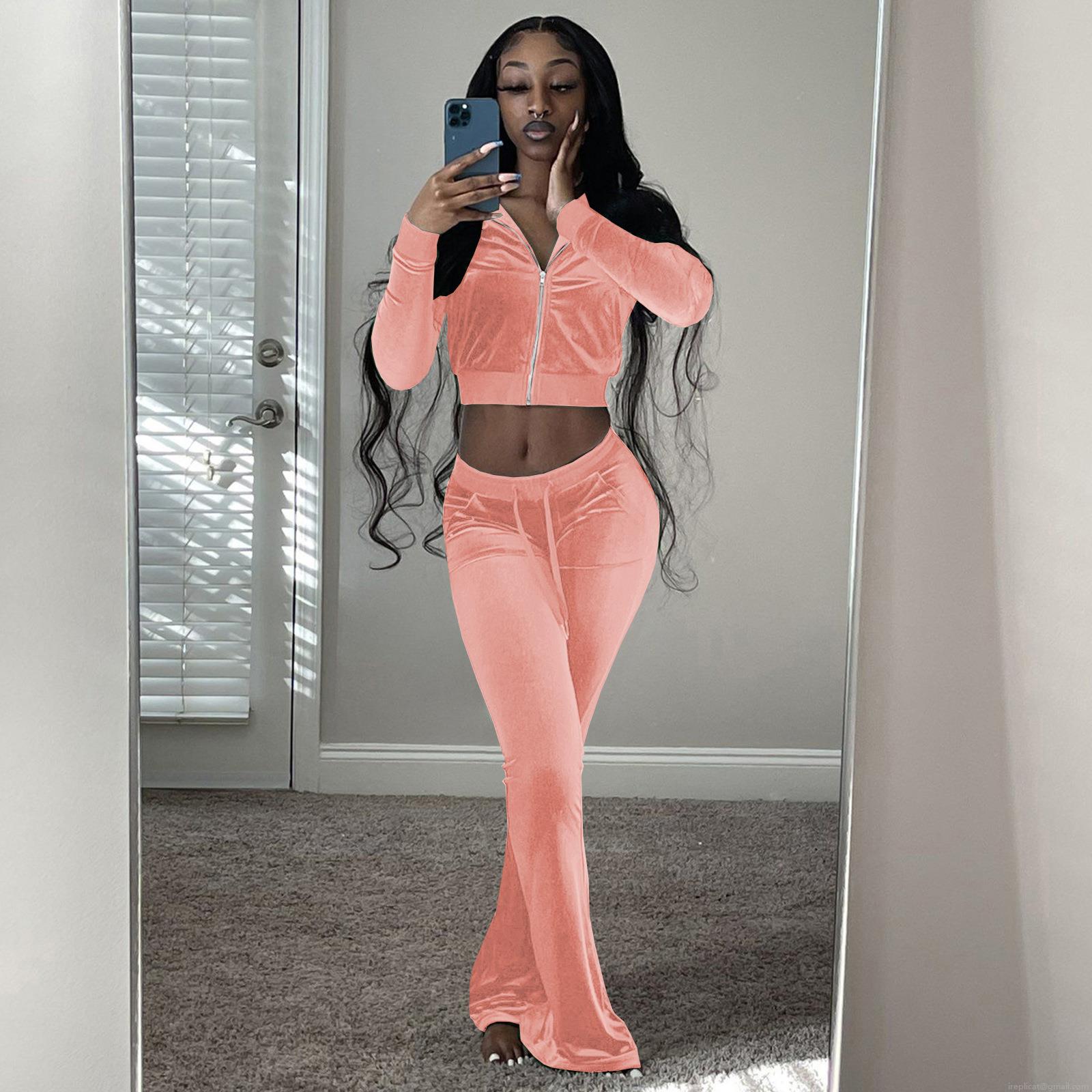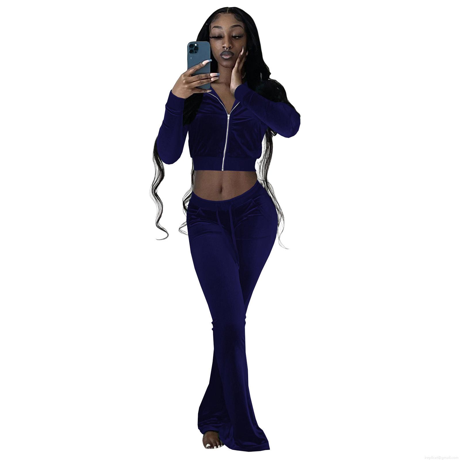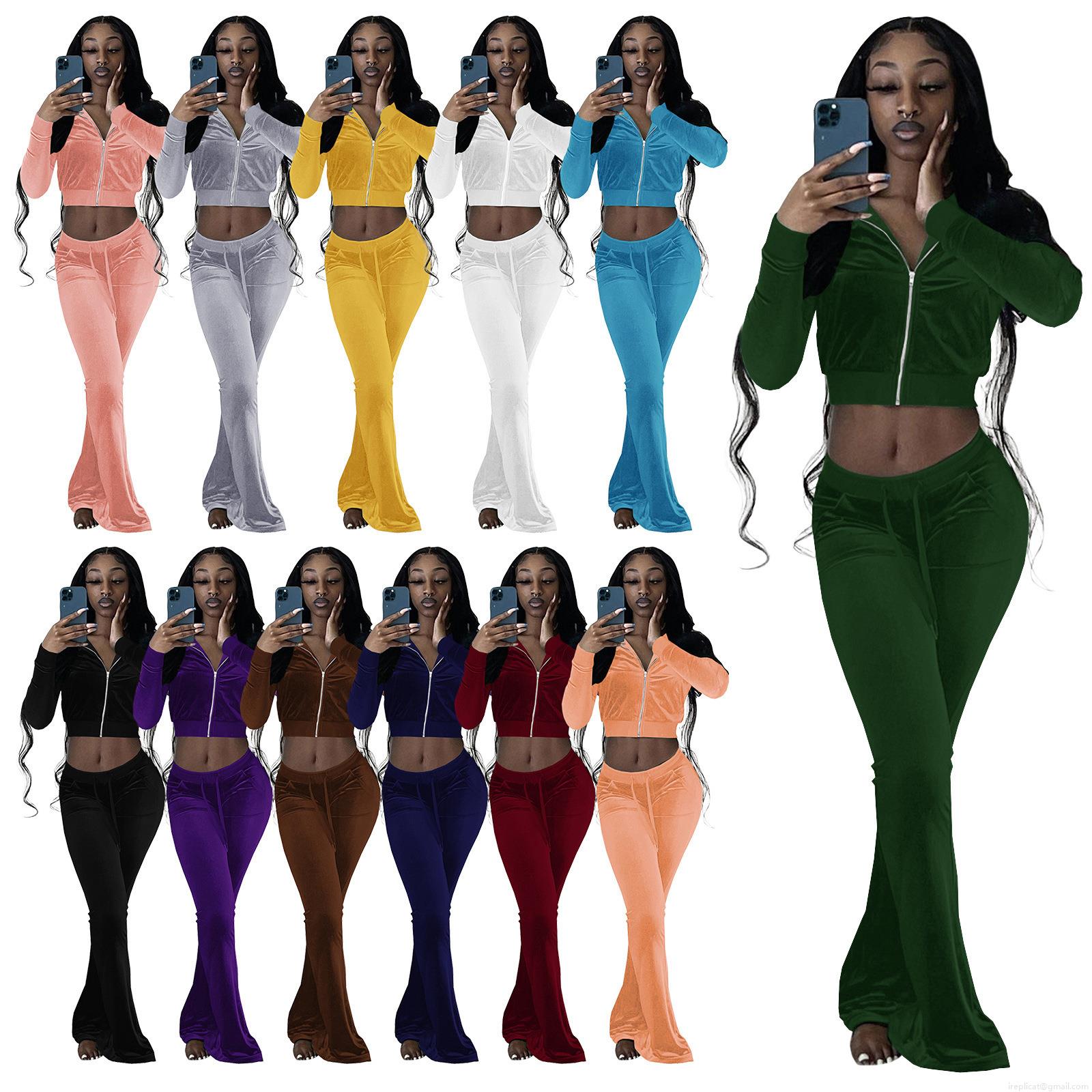 • Women's 2 Piece Velvet Tracksuit Set Solid Color Long Sleeve Crop Zip Hoodie and High Waisted Flare Pants Slim Fit Lounge Outfit Sweatsuit for Women