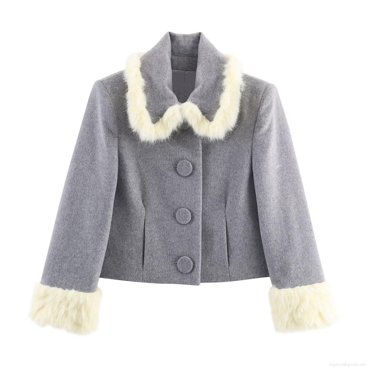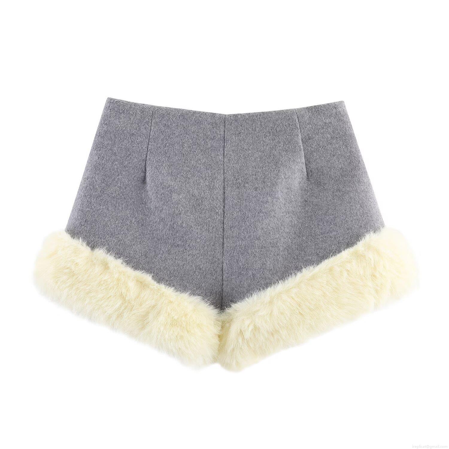 • Women's 2 Piece Woolen Jacket And Shorts Set Faux Fur Trim Grey Long Sleeve Single Breasted Coat High Waist Shorts Elegant Autumn Winter Outfit