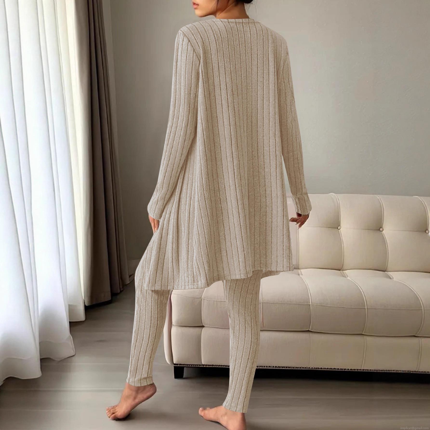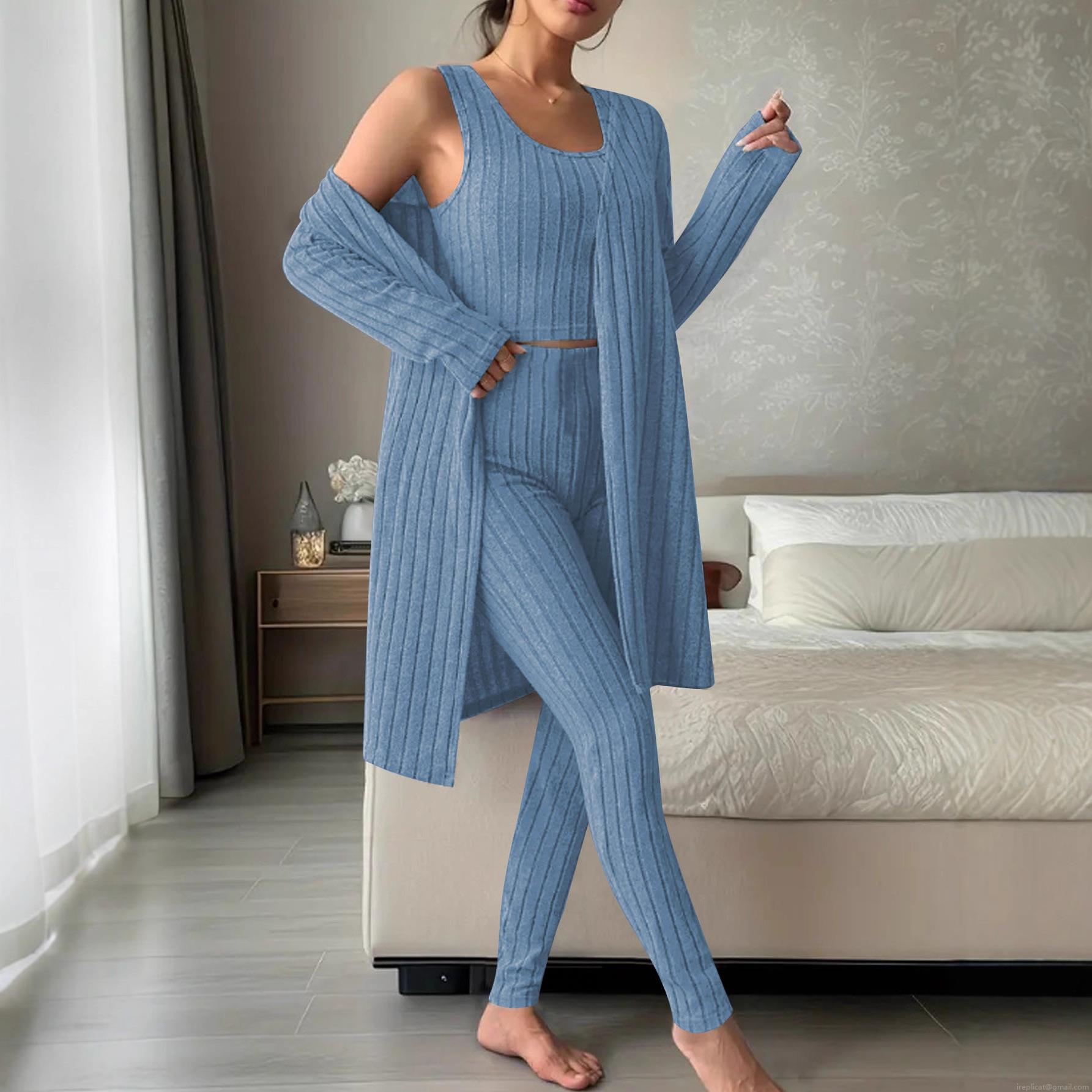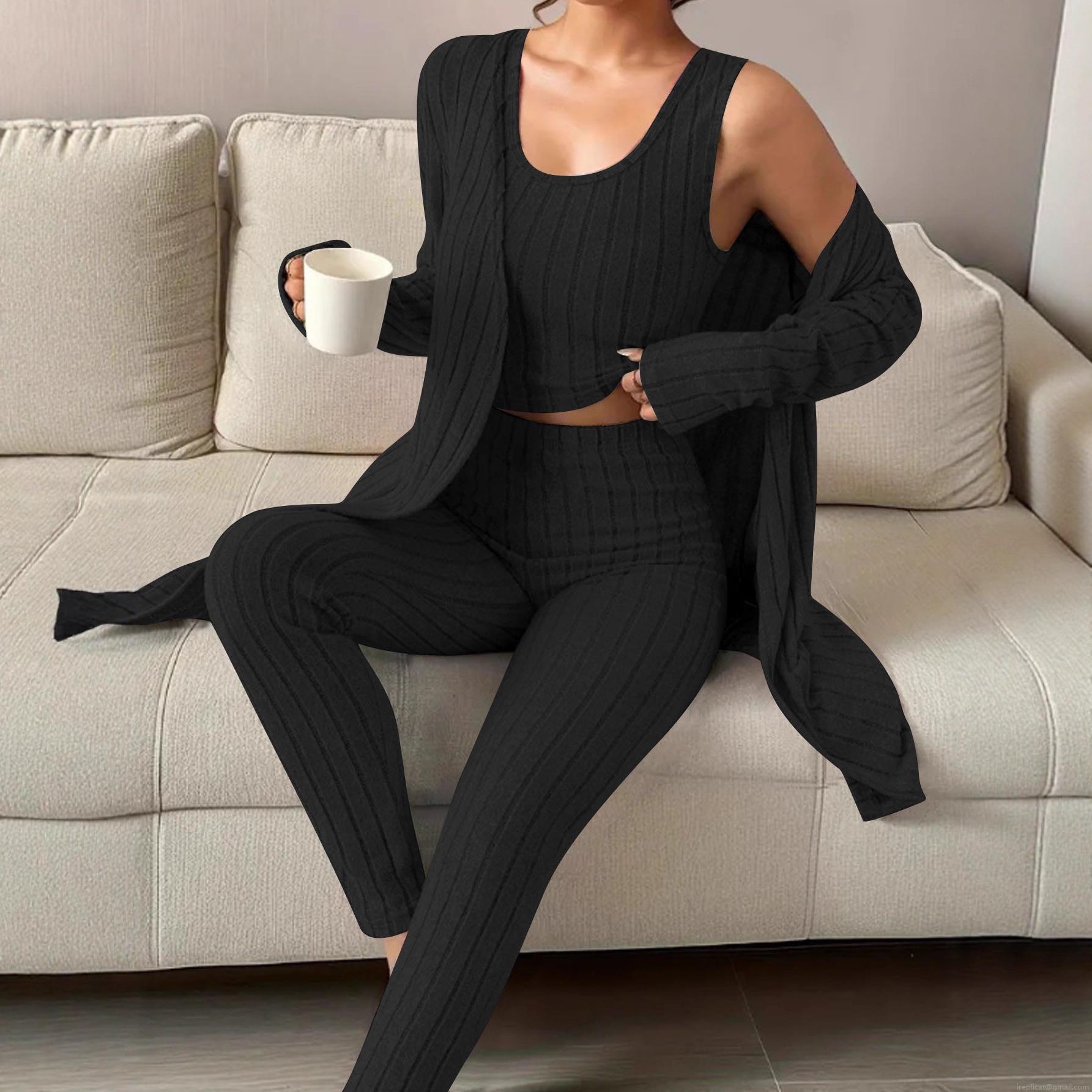 • Women's 3-Piece Ribbed Knit Loungewear Set Plus Size Open Front Cardigan Tank Top And High Waist Pants Casual Home Suits For Autumn Winter