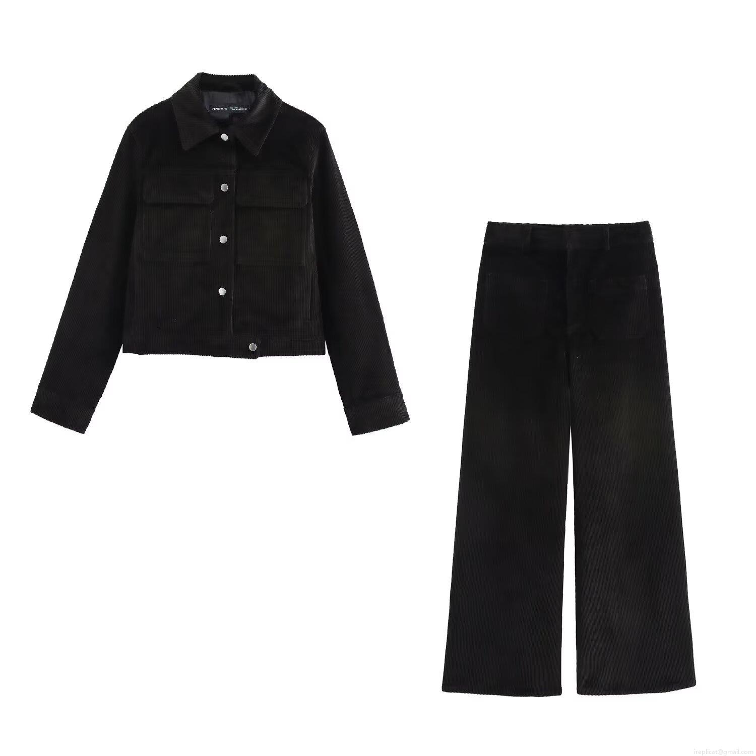 • Women's Black Corduroy Two Piece Set Fashion Short Utility Jacket And High Waist Wide Leg Pants Streetwear Casual Suit Solid Color Long Sleeve Button Coat Trousers Outfits