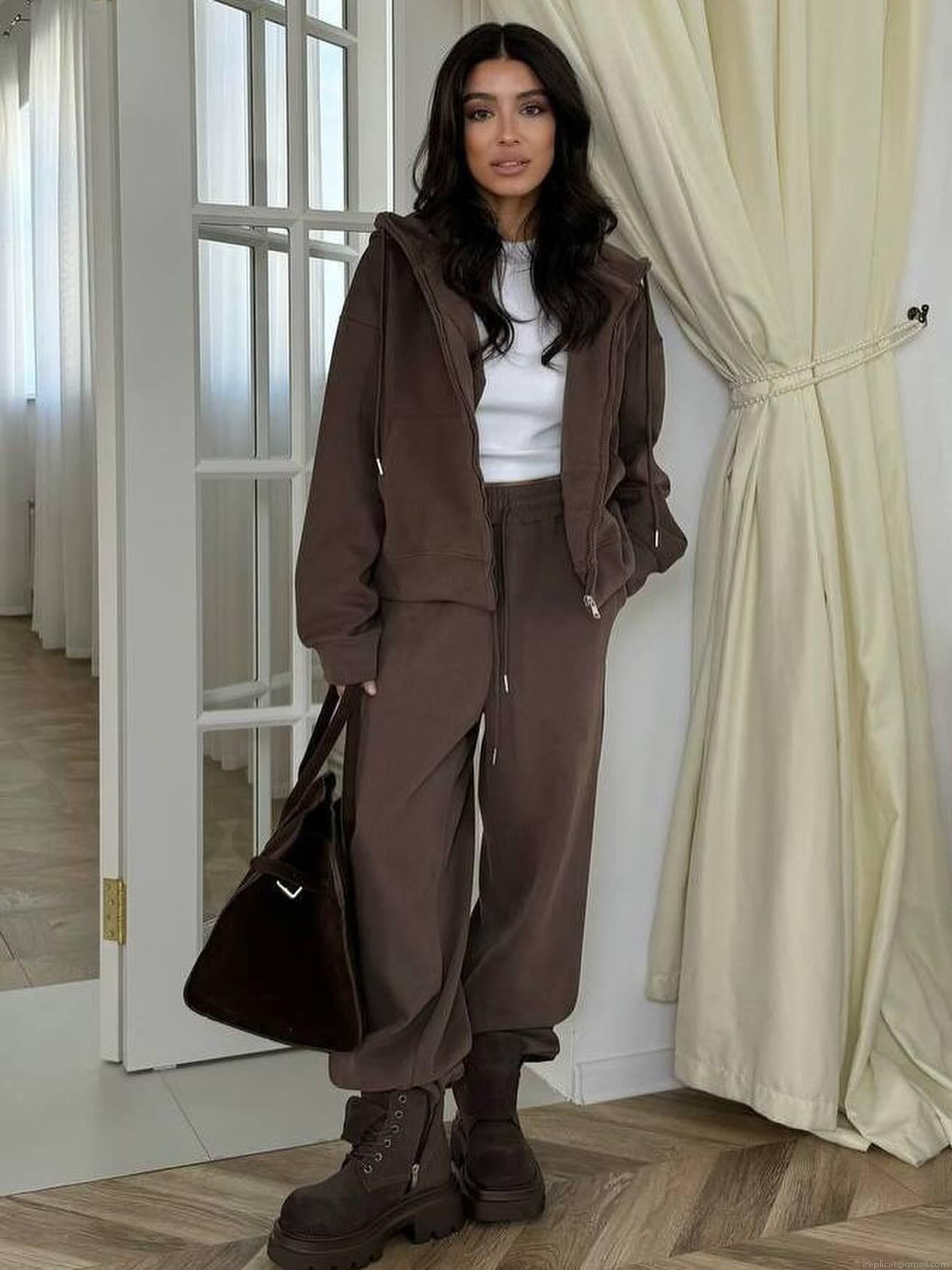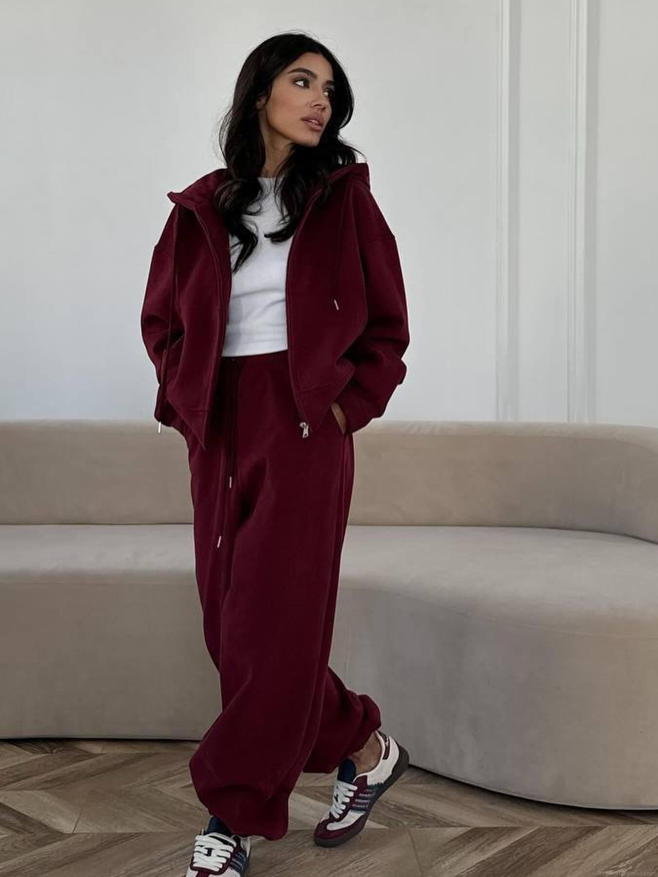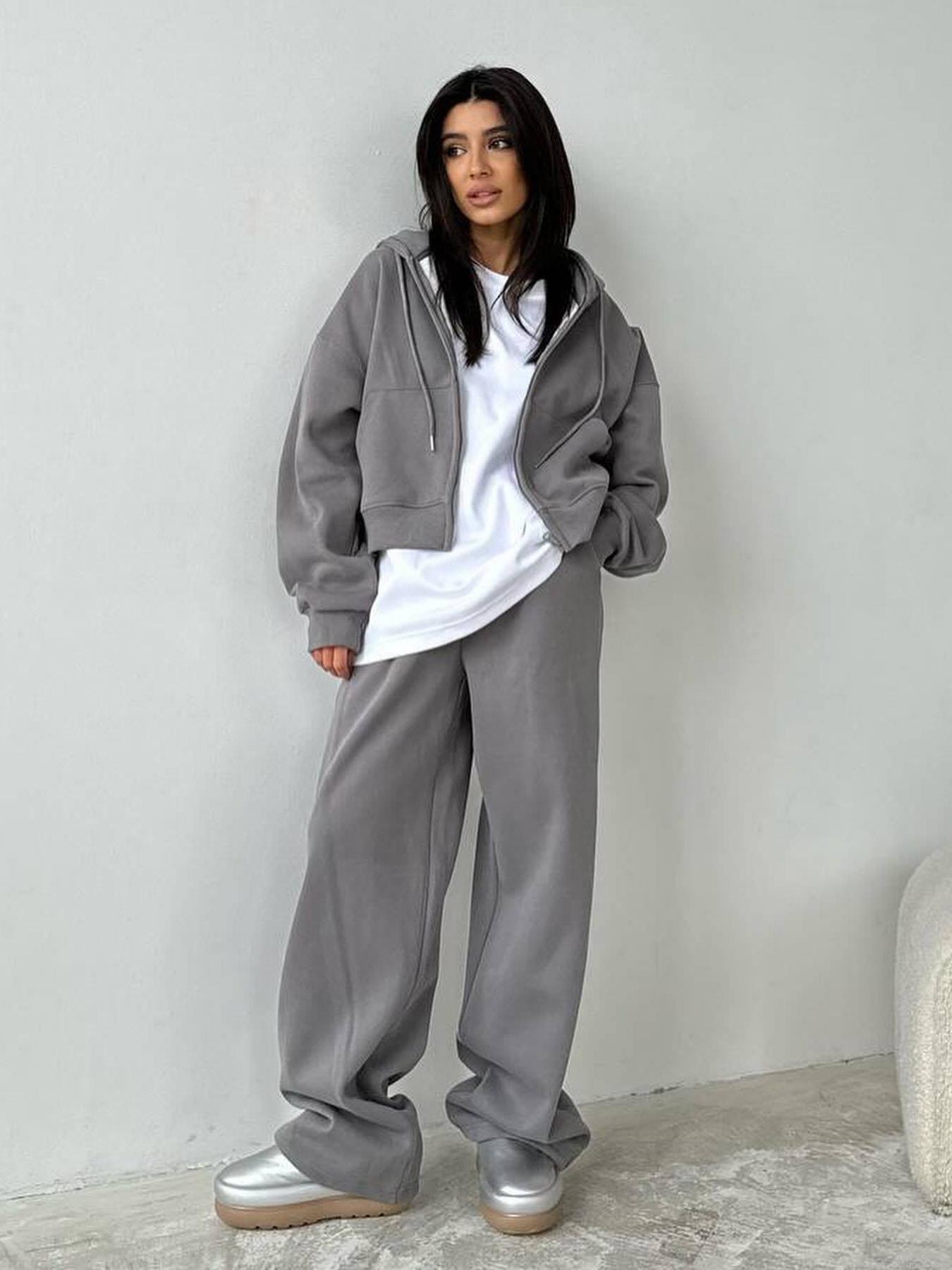 • Women's Casual 100% Cotton Sweatshirt Set Zip-Up Hooded Jacket And High Waist Wide Leg Sweatpants Two-Piece Solid Color Loungewear Sporty Outfit