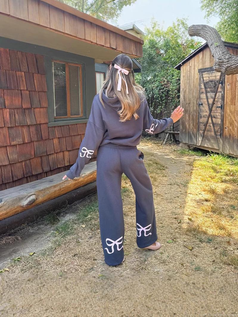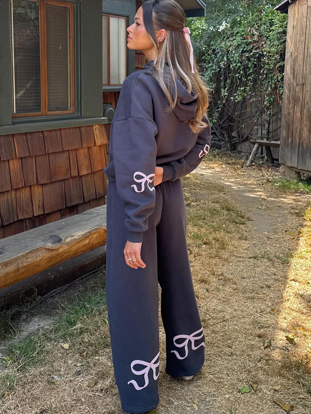 • Women's Casual Bow Print Cotton Blend Hoodie Set Long Sleeve Hooded Sweatshirt And Wide Leg Pants Two Piece Tracksuit Outfits