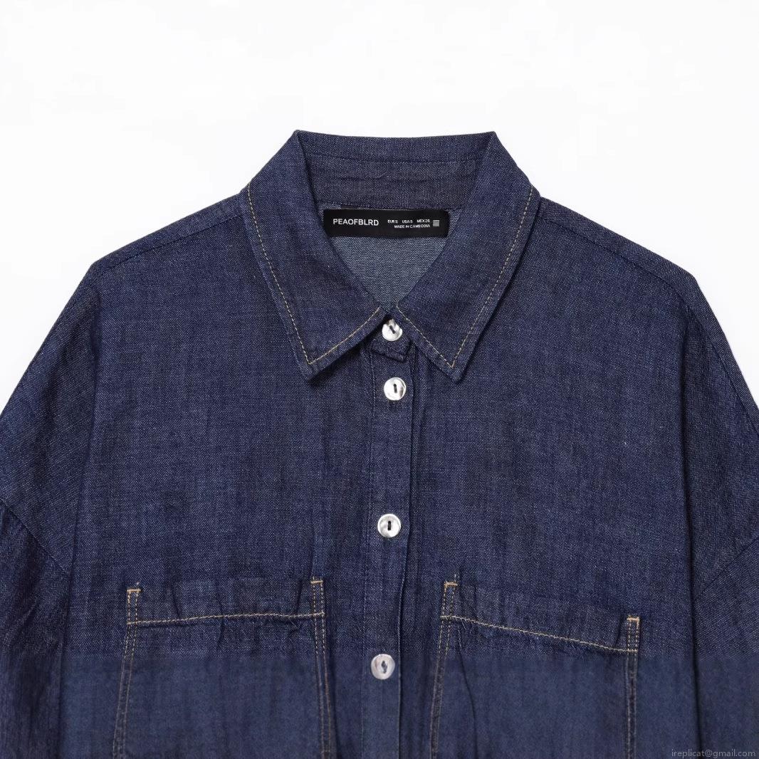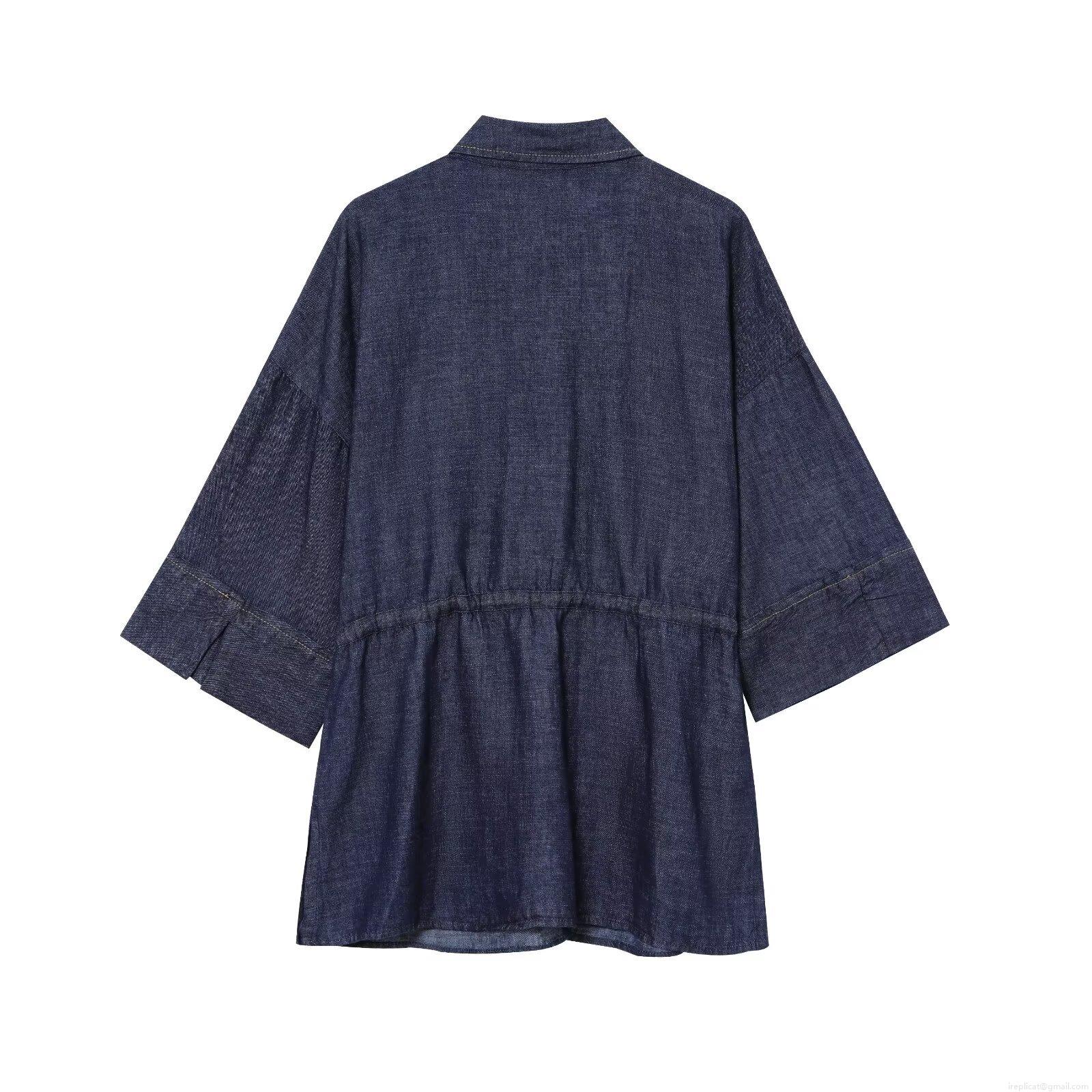 • Women's Casual Denim Two-Piece Set Dark Blue Short Sleeve Drawstring Shirt And Wide Leg Pants Set High Waist Jean Co-ord Outfit For Women Streetwear