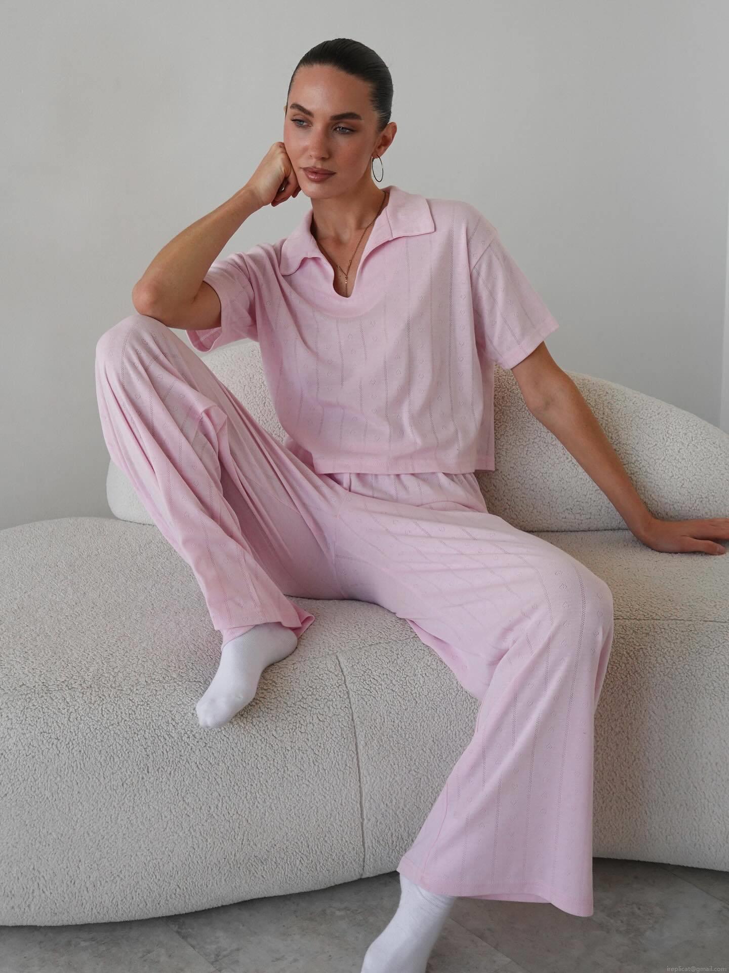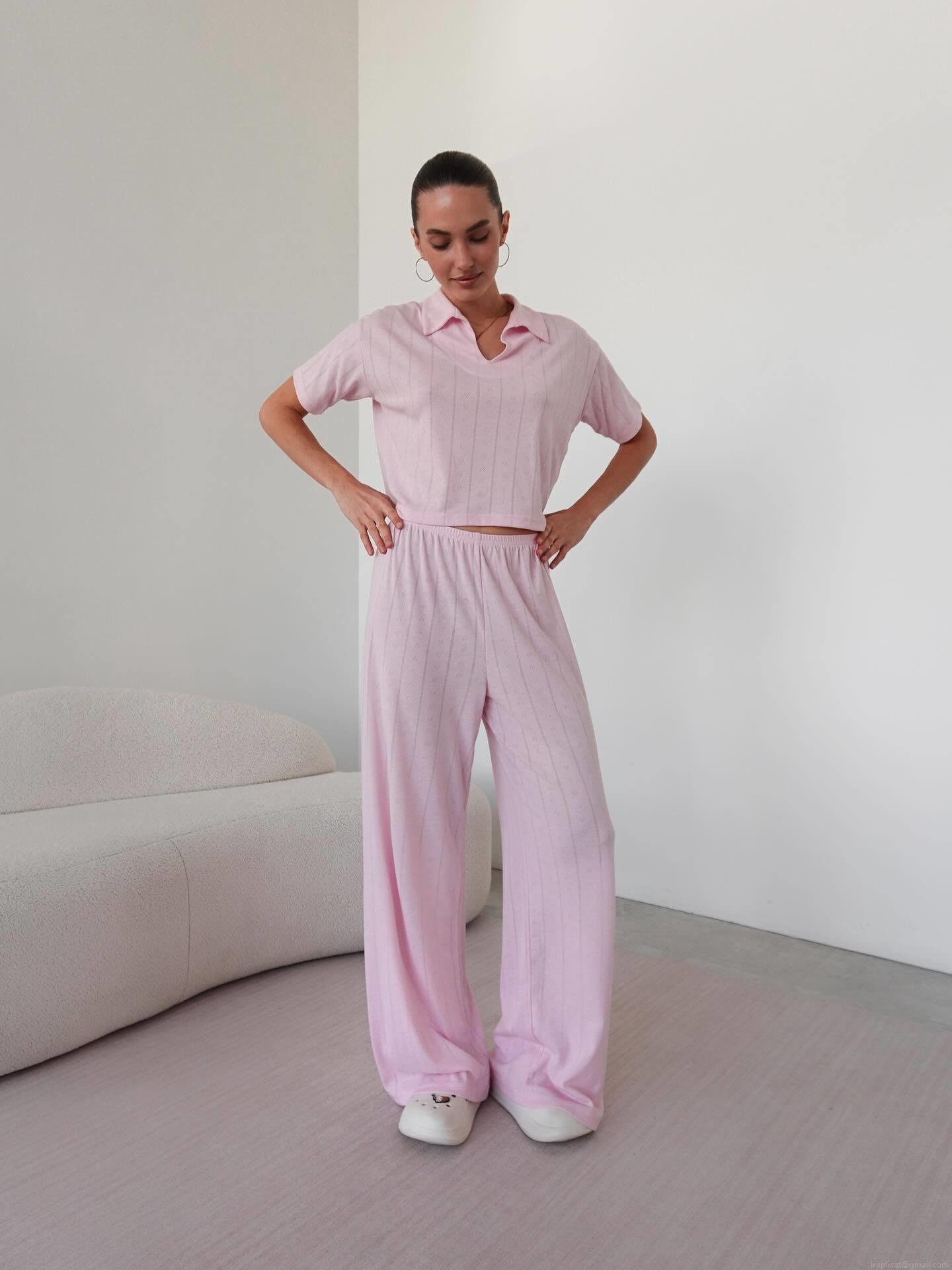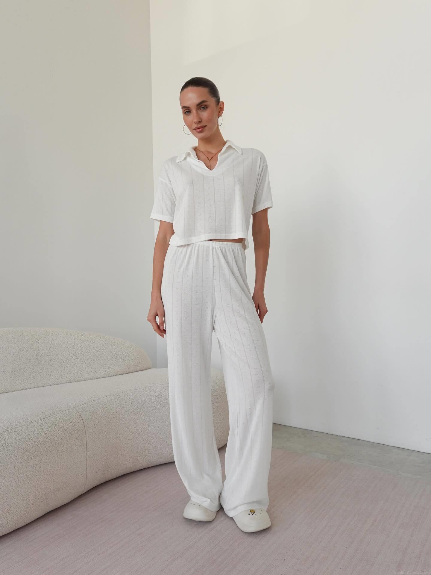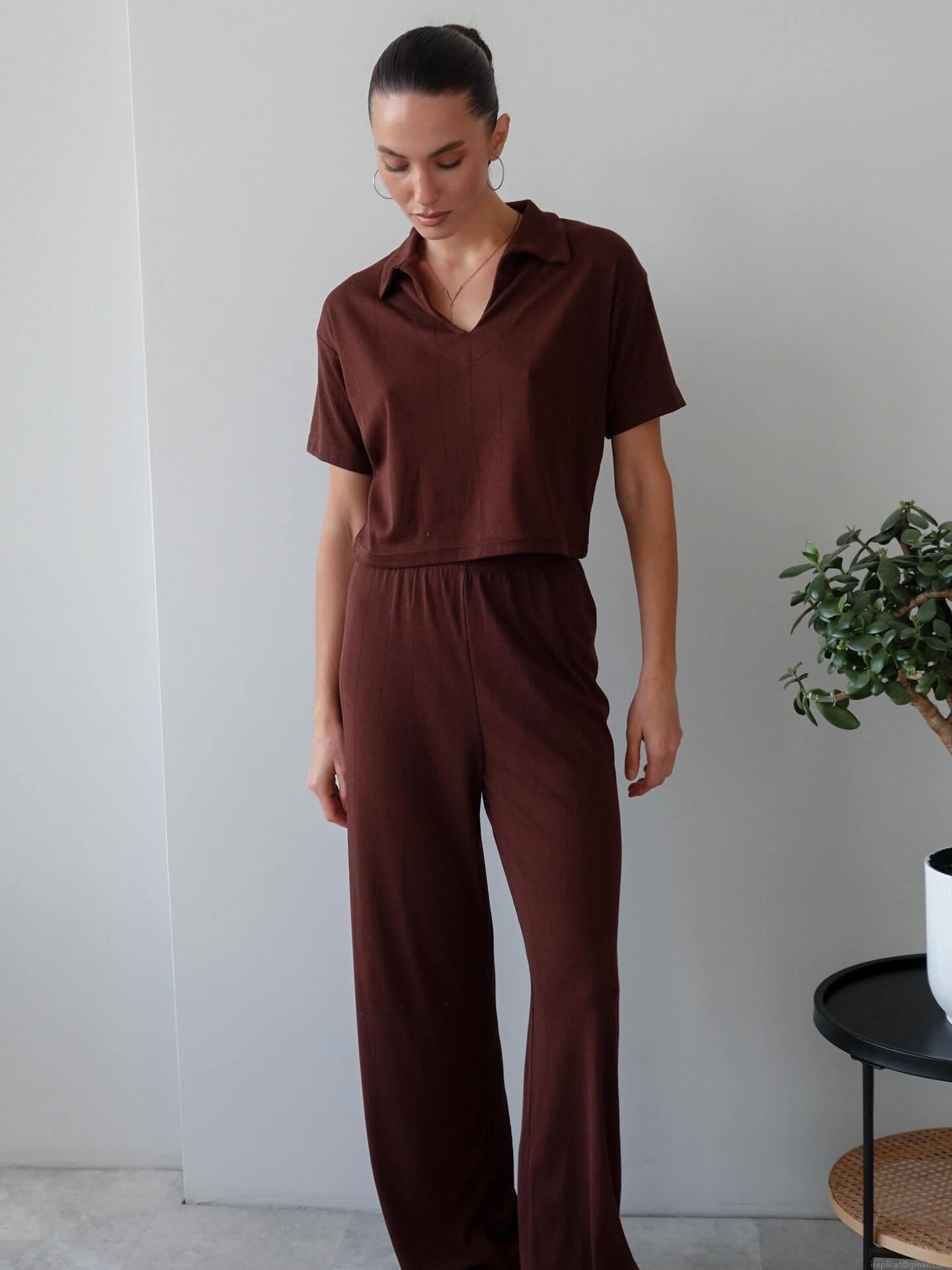 • Women's Casual Knit Two Piece Set Polo V Neck Short Sleeve Crop Top And High Waist Wide Leg Pants Lounge Wear Suit For Women