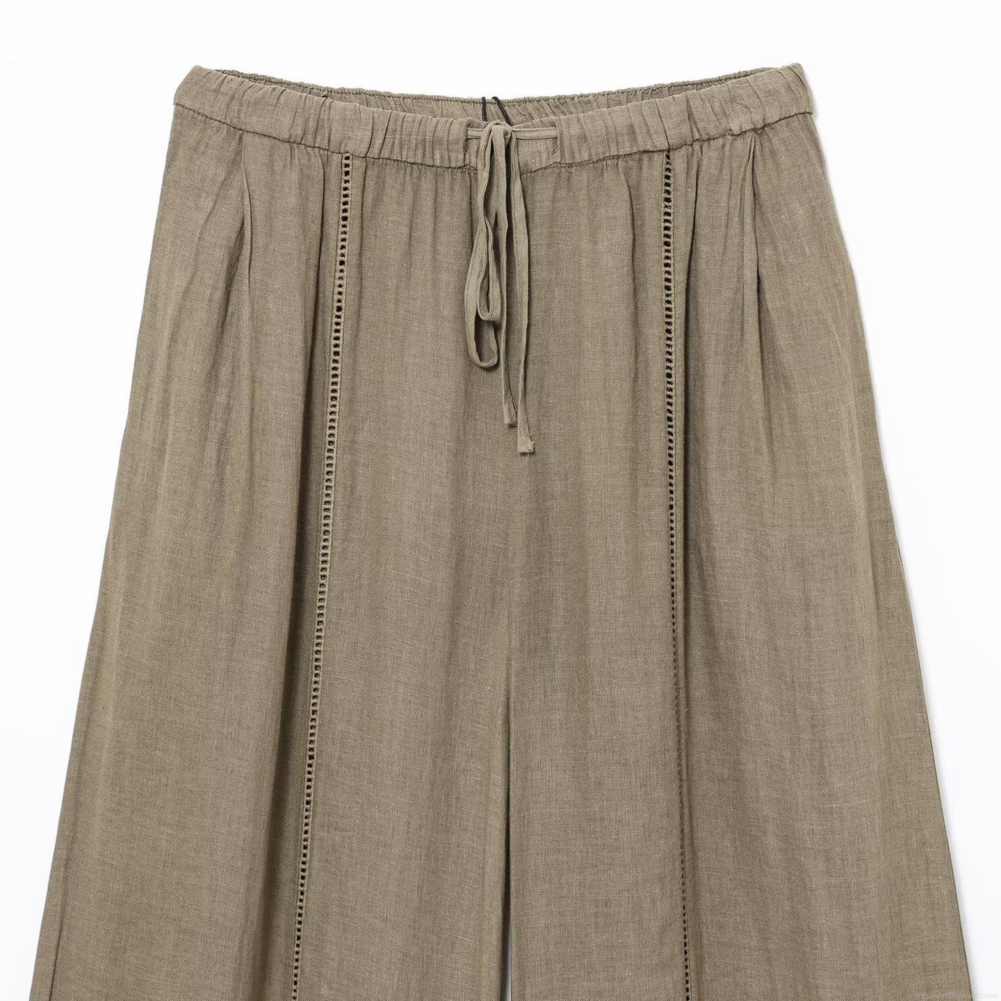 Herringbone Pleats, Drawstring Waist, Shell Buttons, Hollowed-out Decorative Strips
