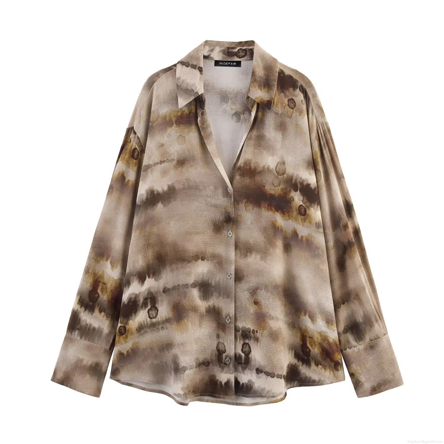 • Women's Casual Tie-Dye Shirt and Pants Set Long Sleeve Button Down Blouse and Wide Leg Drawstring Trousers Streetwear Earth Tone Satin Finish Two-Piece Outfit
