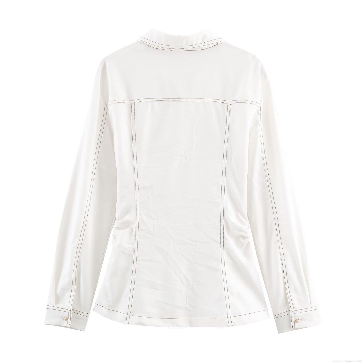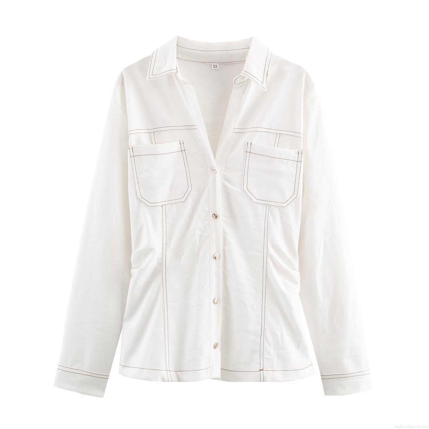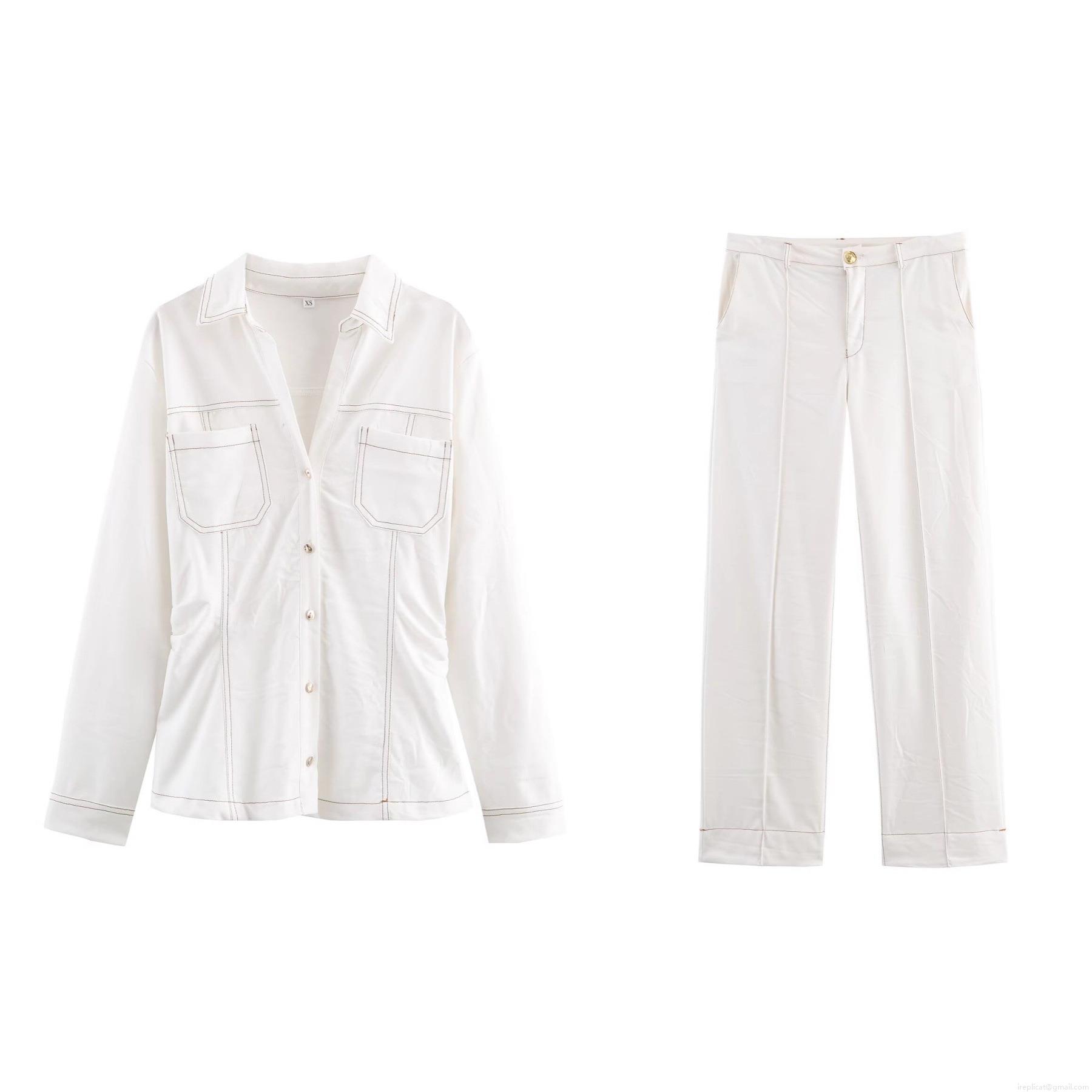 • Women's Casual White Contrast Stitching Denim Style Two Piece Set Button Down Shirt Jacket and High Waist Straight Leg Pants Suit Streetwear