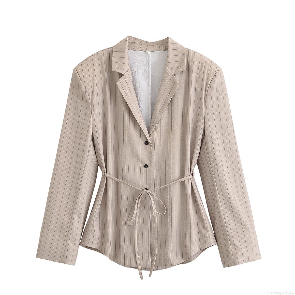 Women's Chic Blazer Jacket And Mini Shorts Polyester Striped Solid Color Tie Waist Lapel Two Piece Set For Office Casual Streetwear