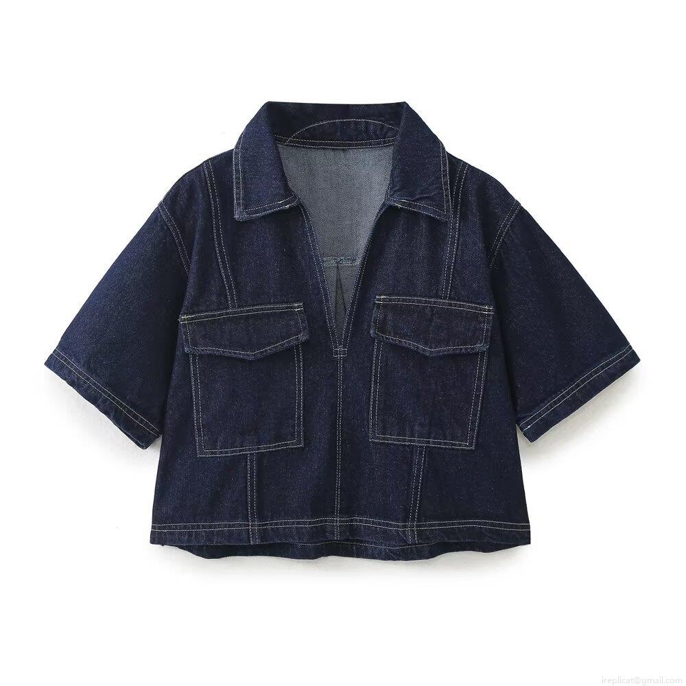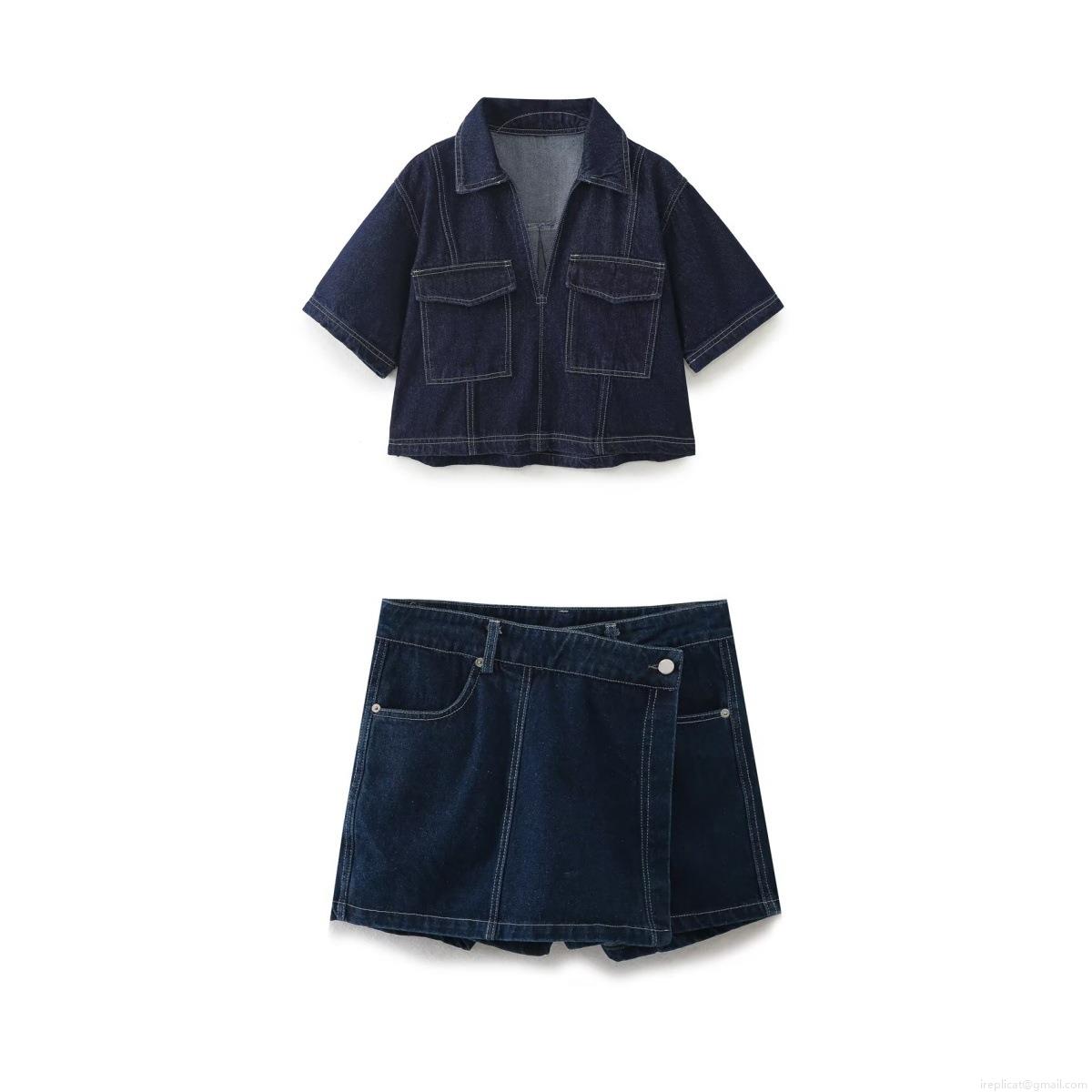 • Women's Denim 2-Piece Set Short Sleeve Button Up V-Neck Shirt And Asymmetric Wrap Skort Washed Blue Retro Streetwear Summer Outfits Casual Two Piece Clothing For Women