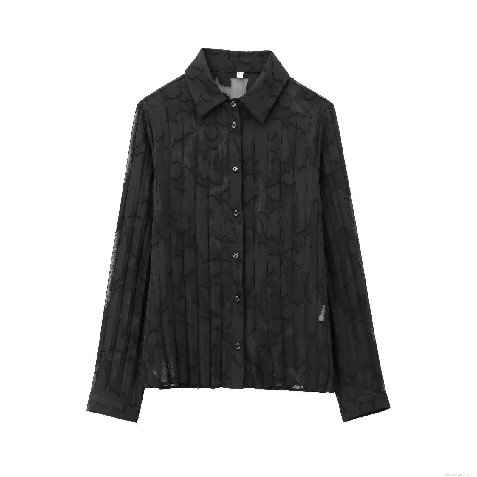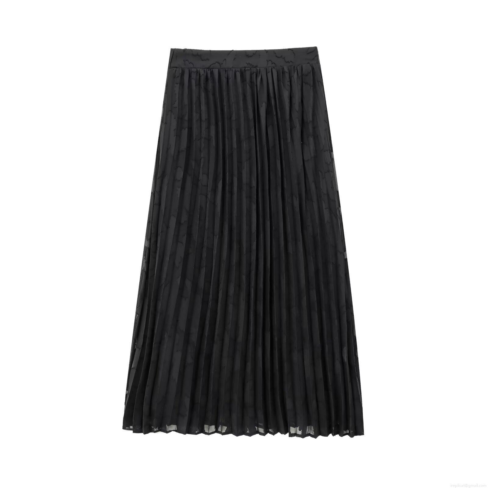 • Women's Elegant Black Chiffon Burn-out Floral Shirt and Pleated Midi Skirt Two-Piece Set Casual Long Sleeve Semi-Transparent Top and Elastic Waist Skirt Streetwear Outfits