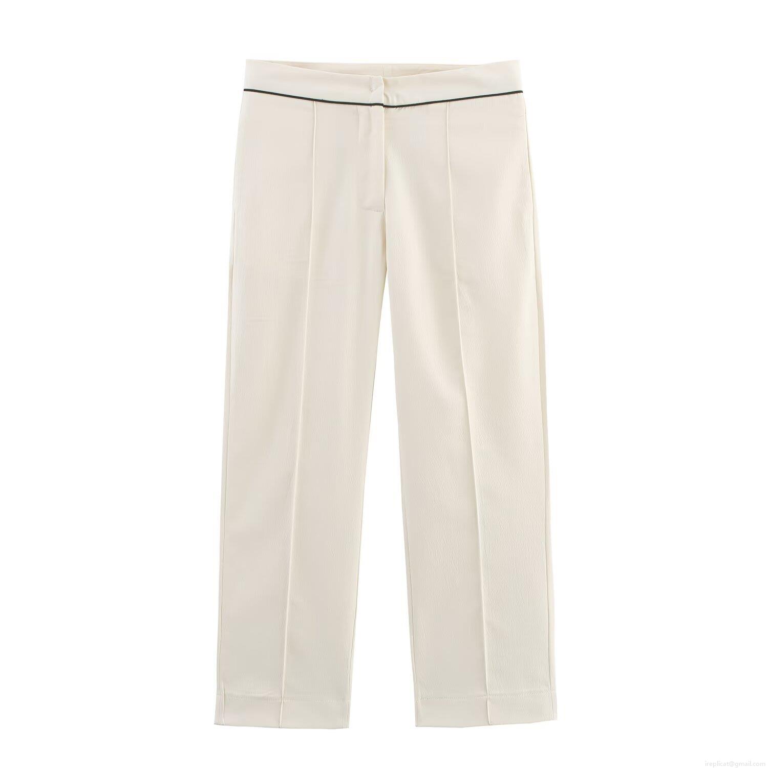 • Women's Elegant Polyester Contrast Piping Two-Piece Suit Set Double Breasted Blazer and High Waist Straight Leg Pants Office Workwear Outfit