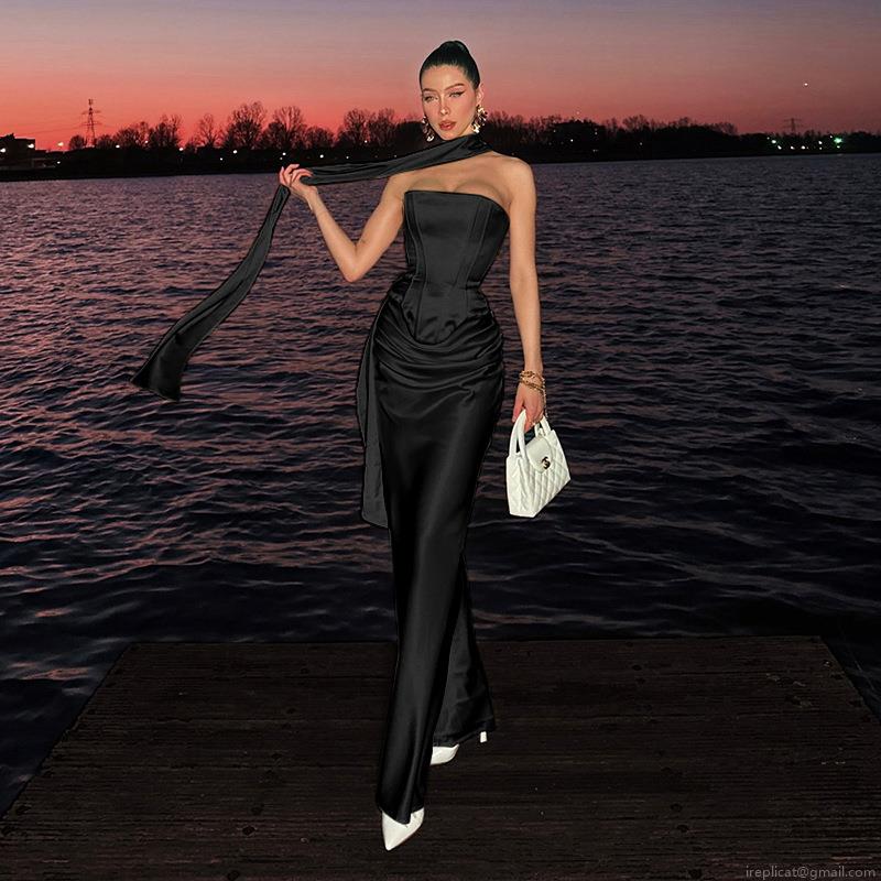• Women's Elegant Satin Corset Top and Maxi Fishtail Skirt Two Piece Set Sexy Strapless Bodycon Evening Party Wedding Dress Outfits with Scarf