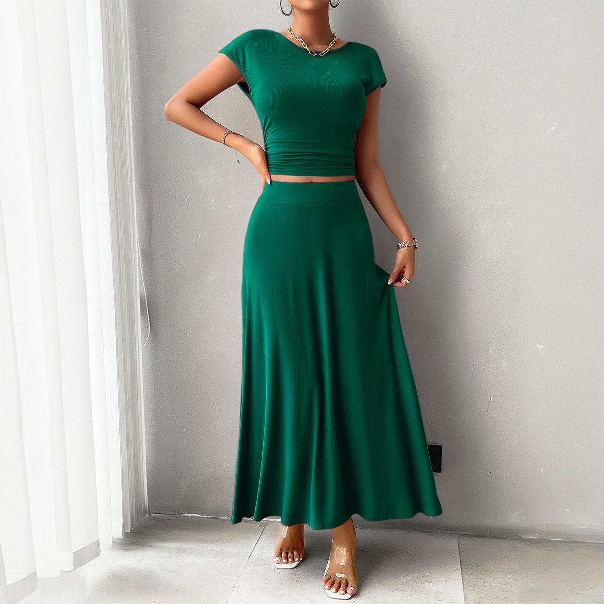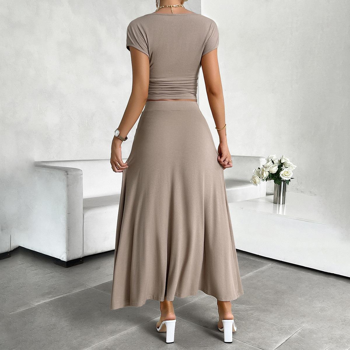 • Women's Elegant Two-Piece Skirt Set Rib-Knit Short Sleeve Crop Top and High Waist Midi A-Line Skirt Set for Office Dating Summer Fashion