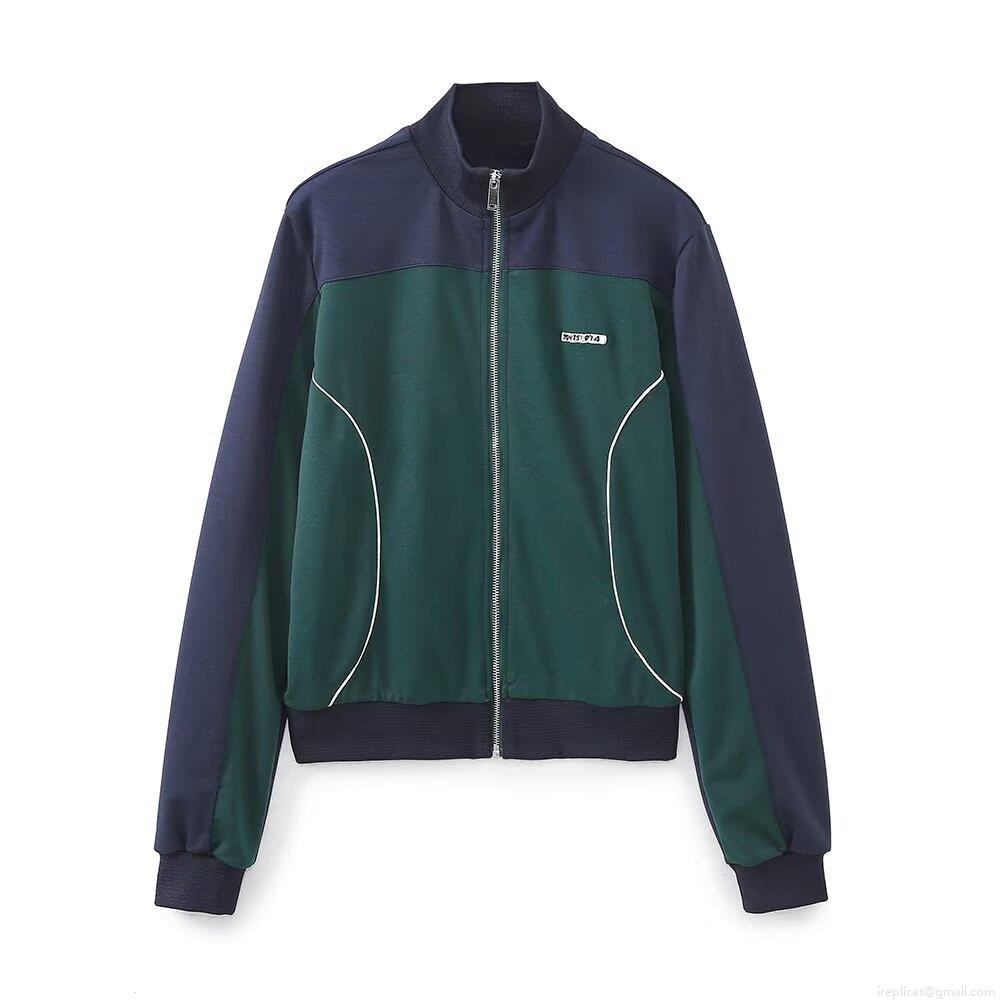 • Women's European Style Color Block Two Piece Set 100% Polyester Zipper Stand Collar Jacket And Striped Wide Leg Pants Casual Streetwear Sporty Outfit For Women