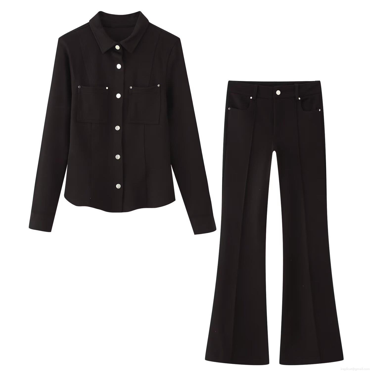 • Women's Fashion Slim Fit Crepe Long Sleeve Shirt And Low Waist Flare Pants Two Piece Set Streetwear Solid Color Casual Suits For Women