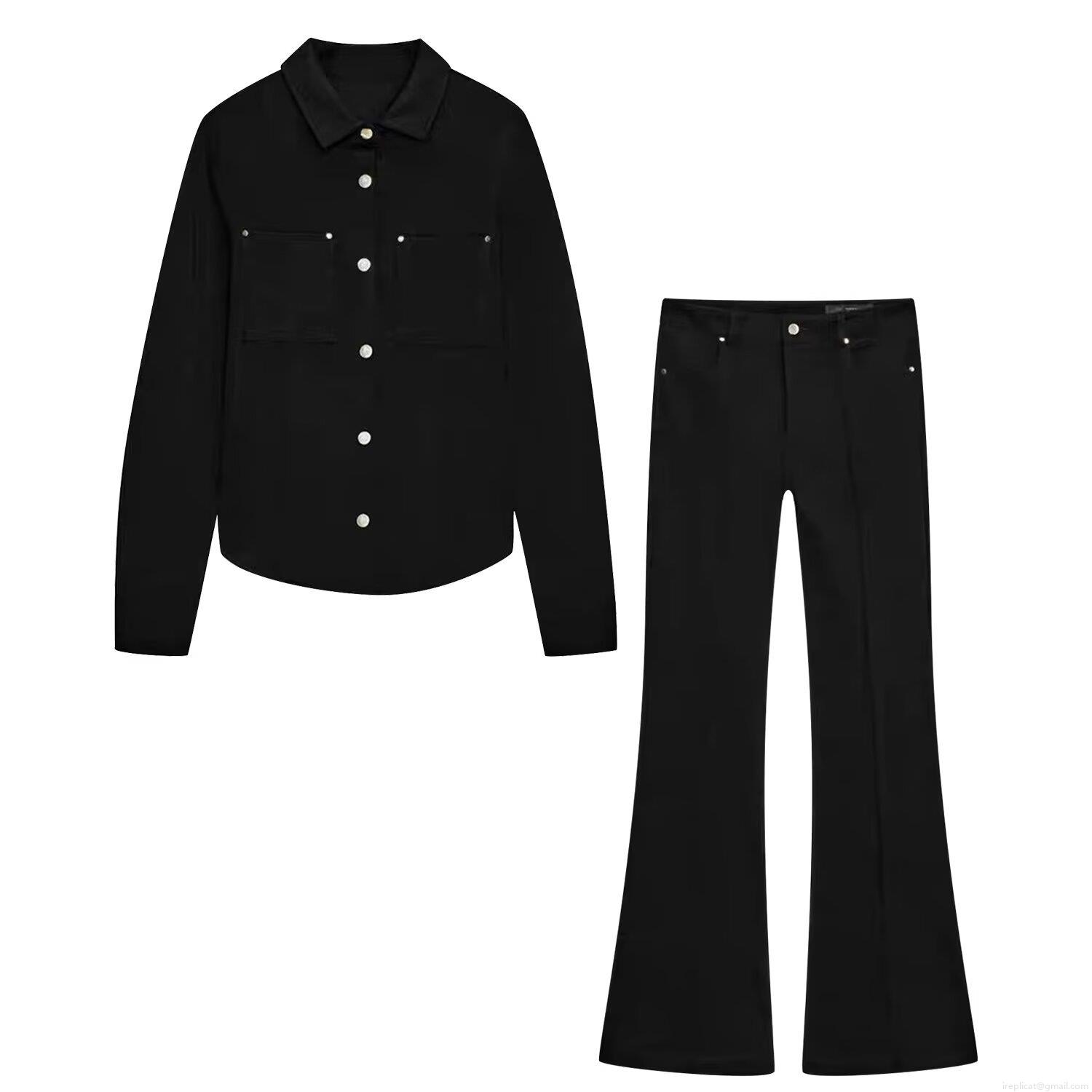 Women's Fashion Slim Fit Crepe Long Sleeve Shirt And Low Waist Flare Pants Two Piece Set Streetwear Solid Color Casual Suits For Women