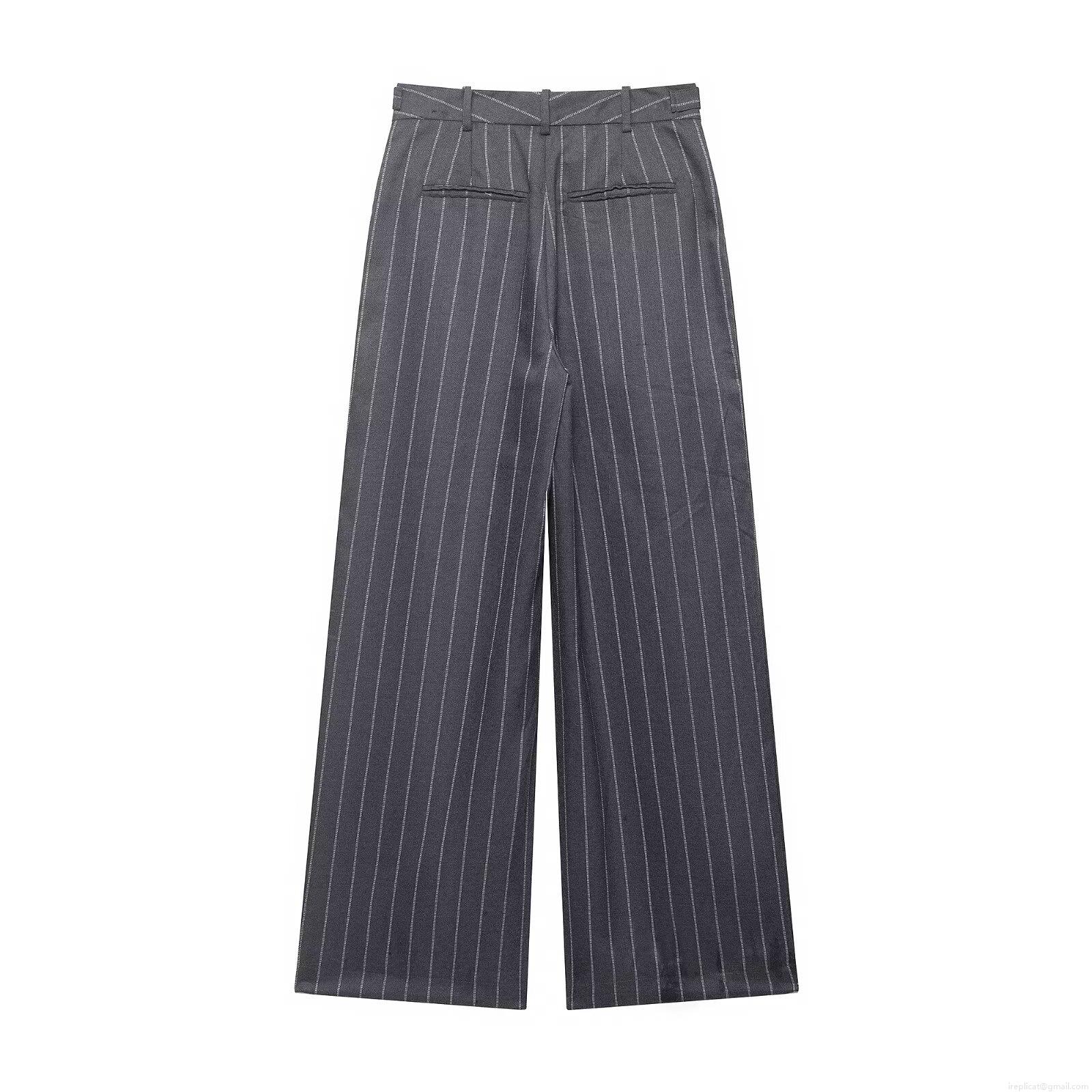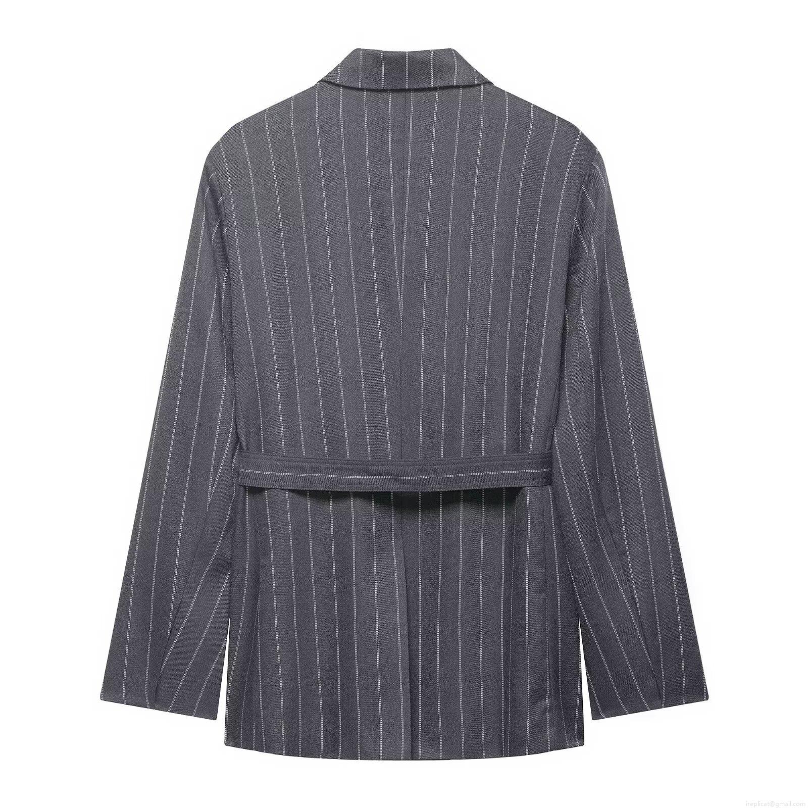 • Women's Grey Striped Two Piece Suit Set 100% Polyester Tie Waist Blazer Jacket And High Waist Wide Leg Straight Pants For Office Professional Elegant Work Outfit