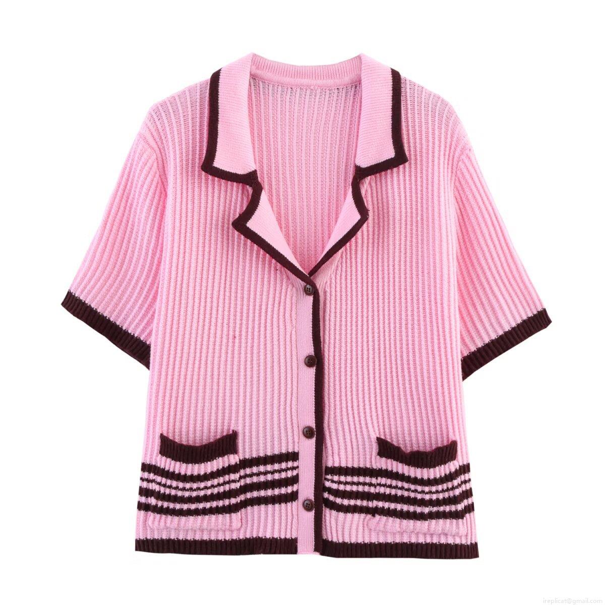 Women's Knitted Two Piece Set Pink Striped V Neck Polo Cardigan Short Sleeve Button Down Top And High Waist Drawstring Shorts Casual Loungewear Suit