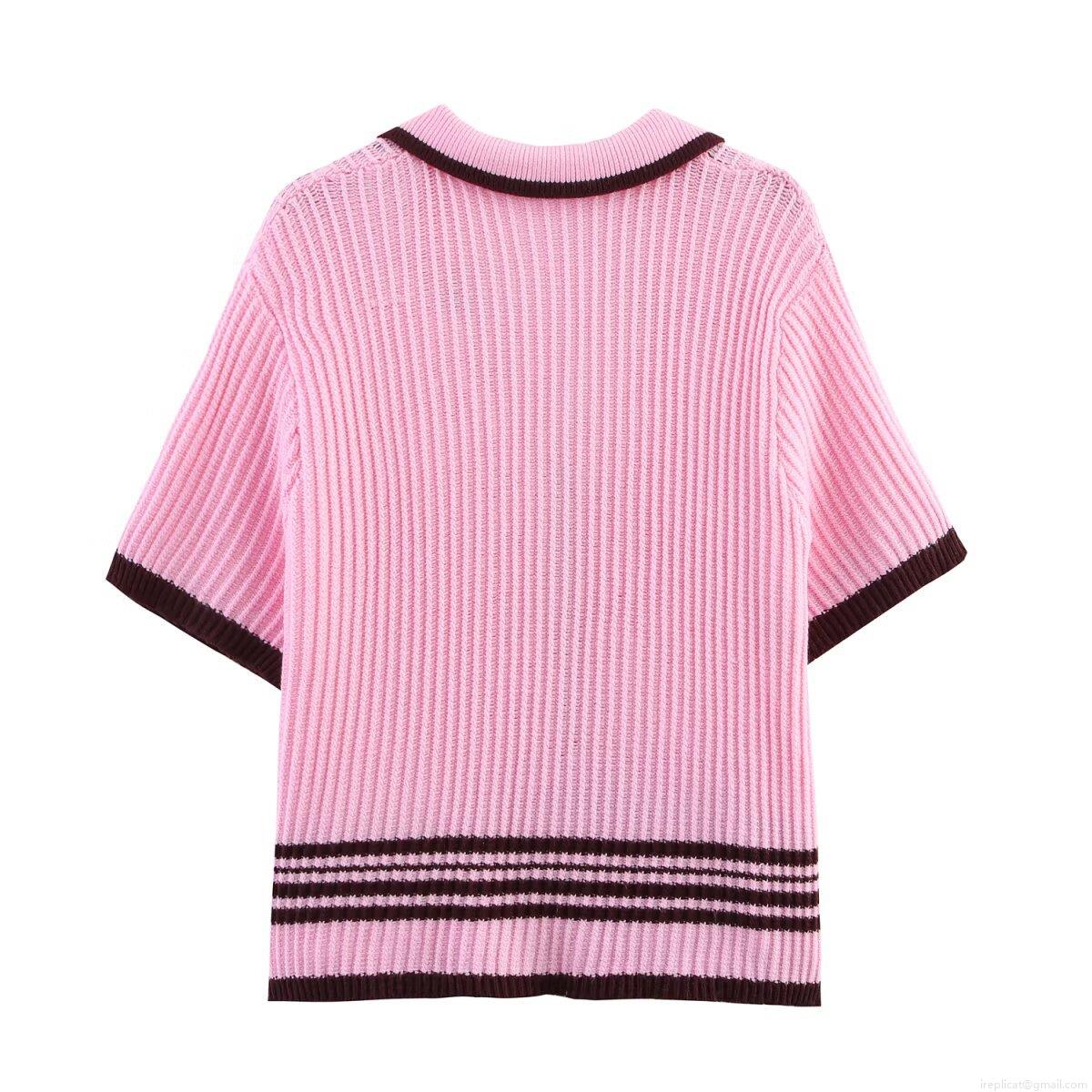 • Women's Knitted Two Piece Set Pink Striped V Neck Polo Cardigan Short Sleeve Button Down Top And High Waist Drawstring Shorts Casual Loungewear Suit