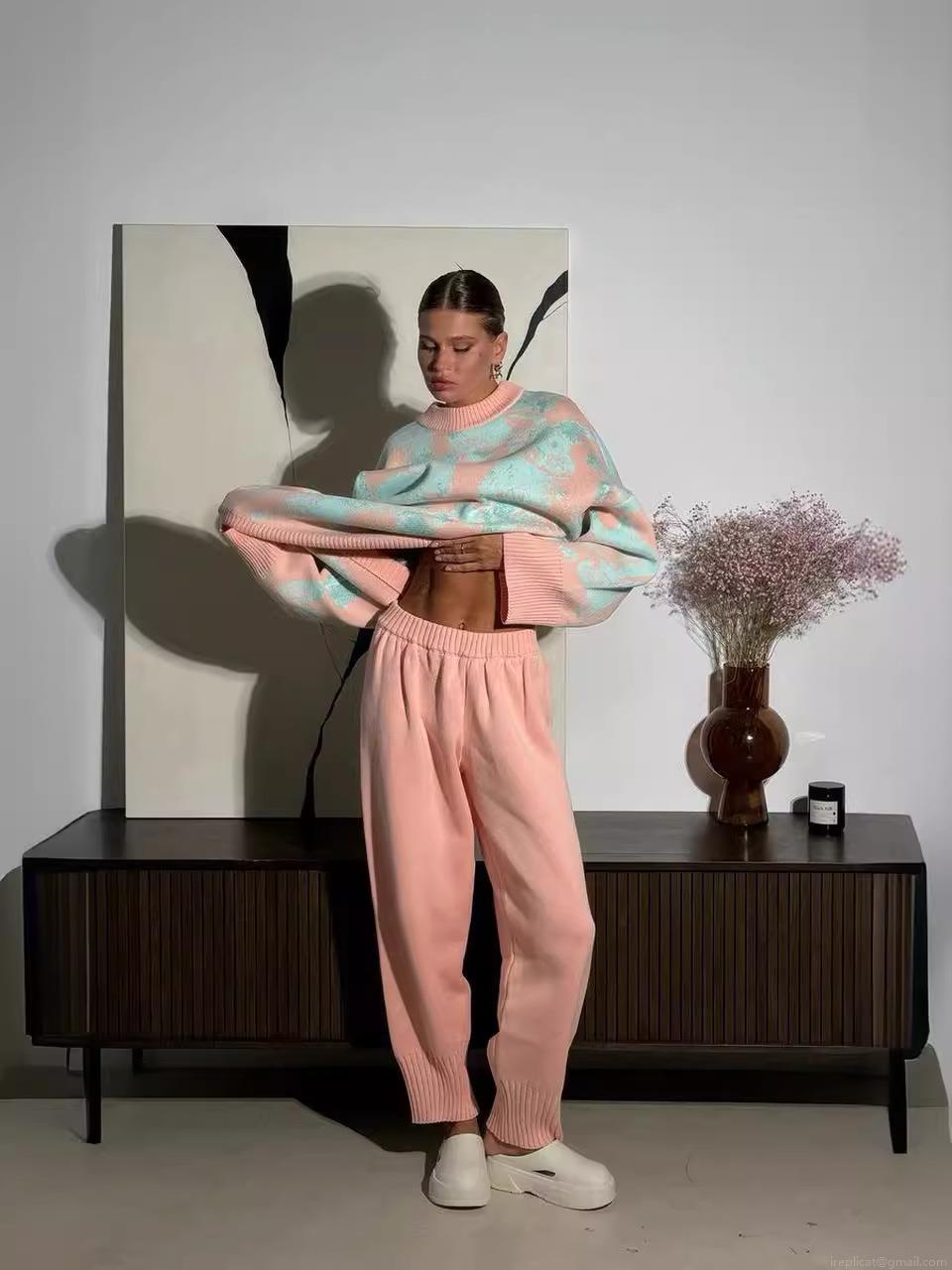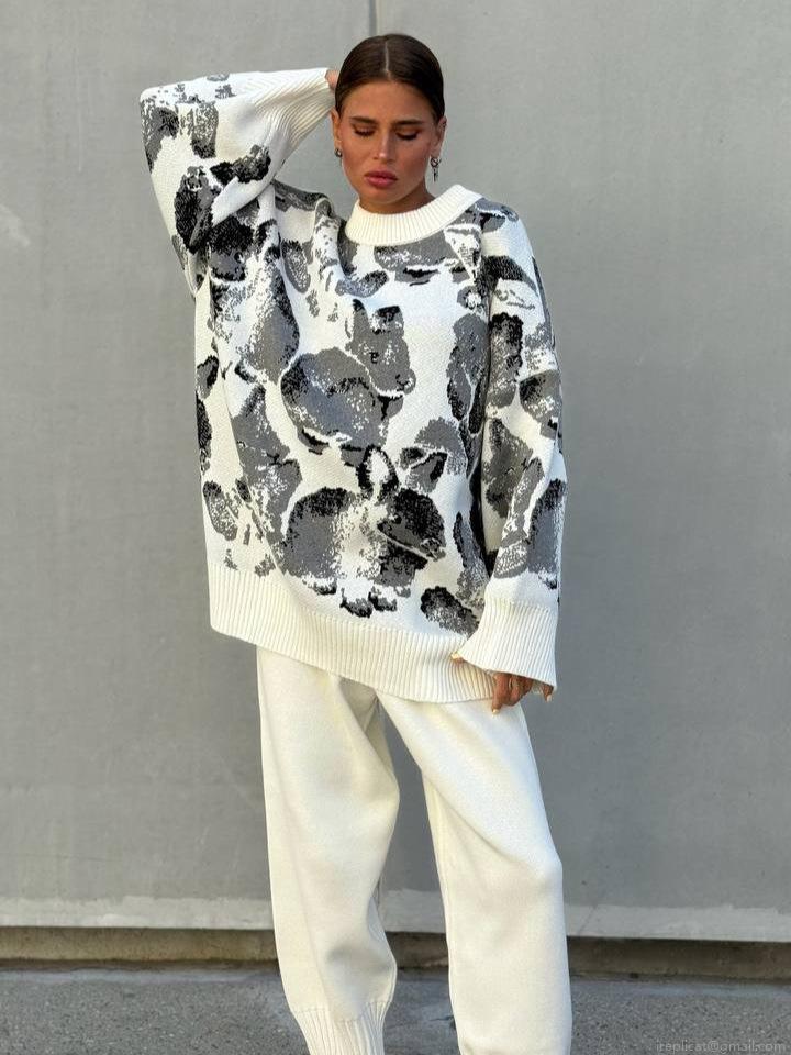 • Women's Knitted Two-Piece Set Cotton Blend Contrast Color Jacquard Rabbit Pattern Long Sleeve Round Neck Sweater And Straight Leg Pants Casual Warm Loungewear Outfit