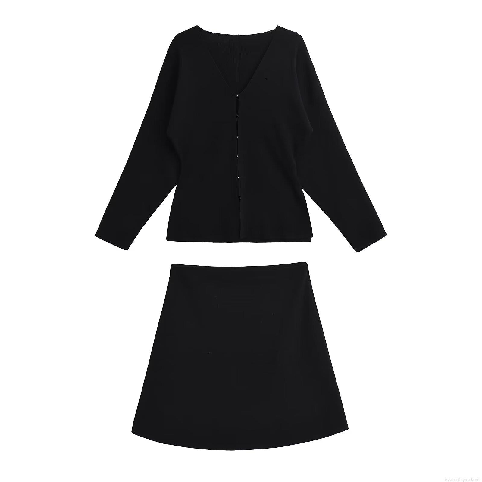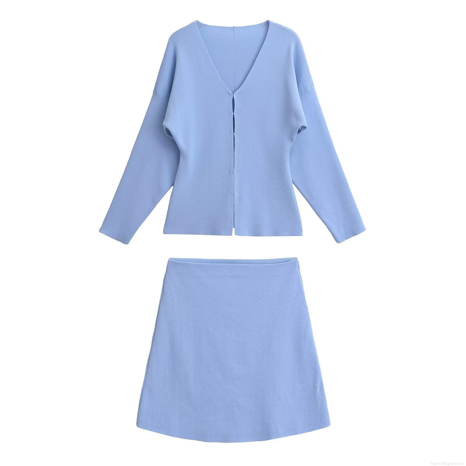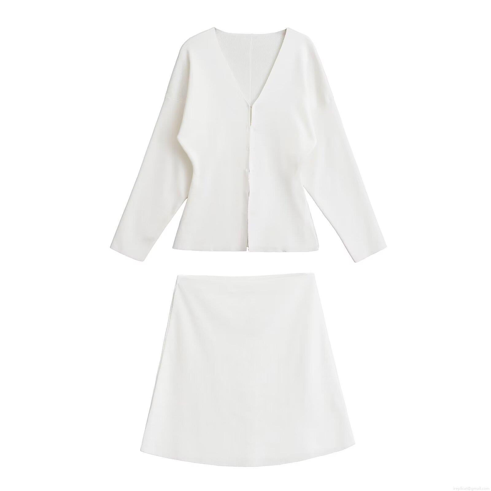 • Women's Mercerized Cotton Knit Two Piece Set V Neck Long Sleeve Cardigan And Mini A-Line Skirt Solid Color Casual Vacation Outfits