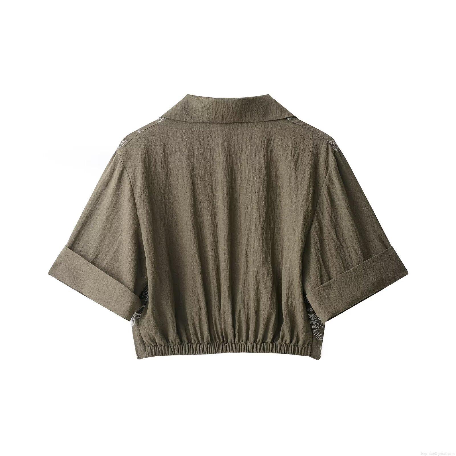 Women's Olive Green Plant Leaf Embroidery Short Sleeve Shirt And Skort Set Vintage Casual Polyester Linen Texture Two-Piece Outfits For Women Streetwear Outfits