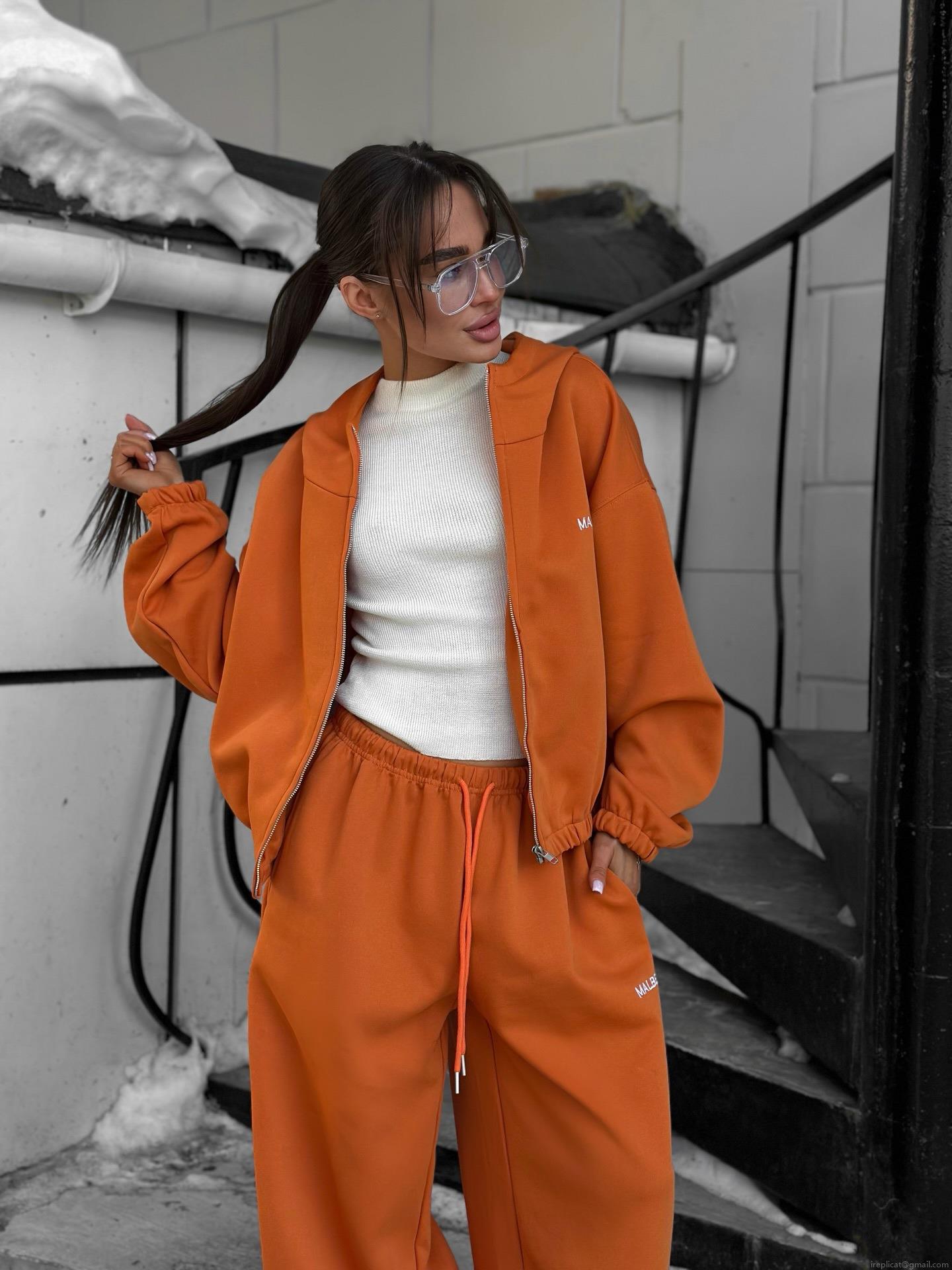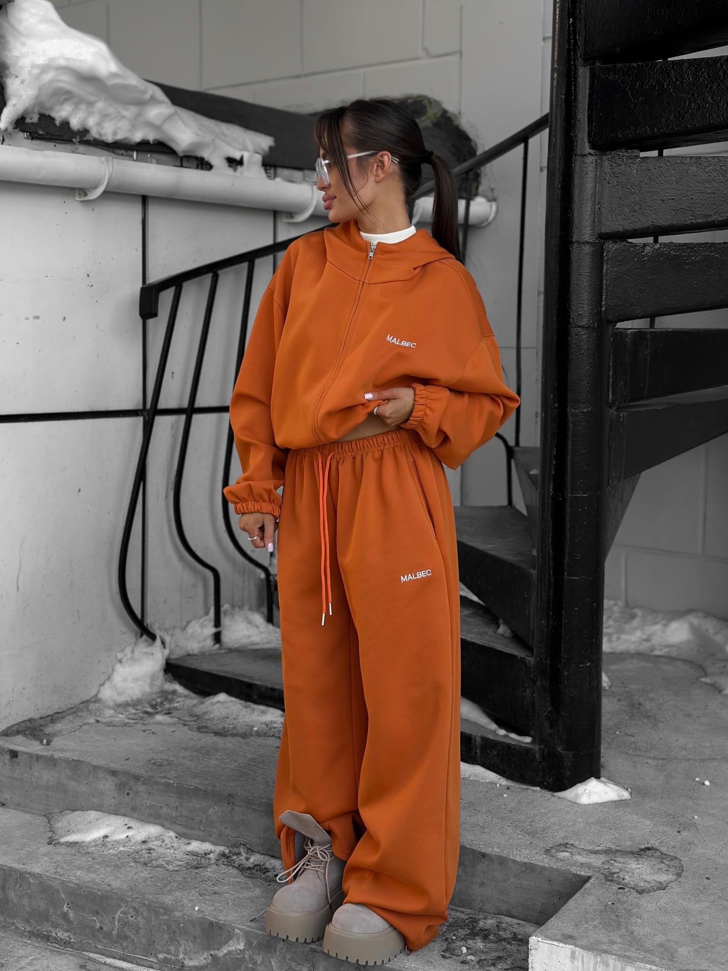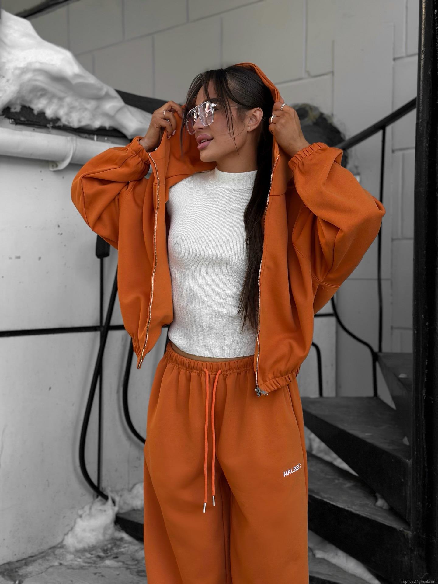 • Women's Oversize Embroidered 100% Cotton Hoodie Set Orange Zip-Up Jacket and Drawstring Sweatpants Casual Tracksuit Streetwear Two-Piece Outfits