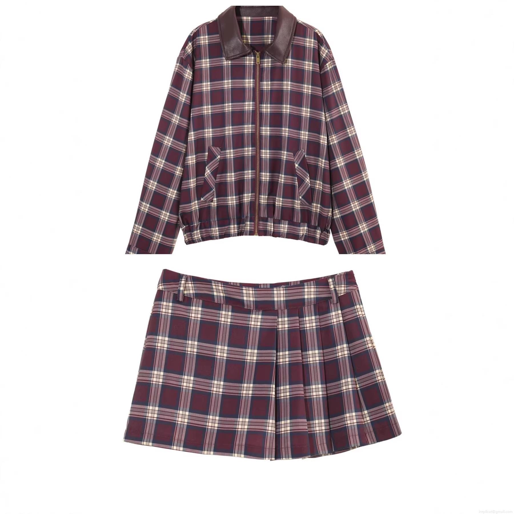 • Women's Plaid Jacket And Skort Set Leather Effect Patchwork Collar Long Sleeve Zipper Bomber Jacket Pleated Mini Skort 2 Piece Outfit Preppy Streetwear Wine Red