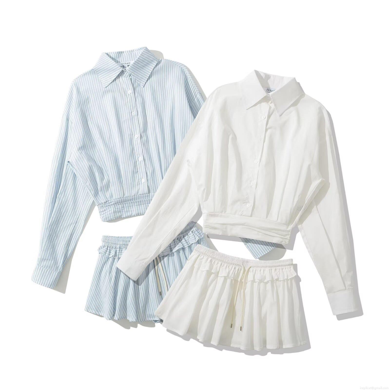 • Women's Preppy Style Two-Piece Set Long Sleeve Lapel Shirt and Ruffle Tie Waist Pleated Mini Skirt Outfit Suit White Blue Striped School Daily Casual Wear