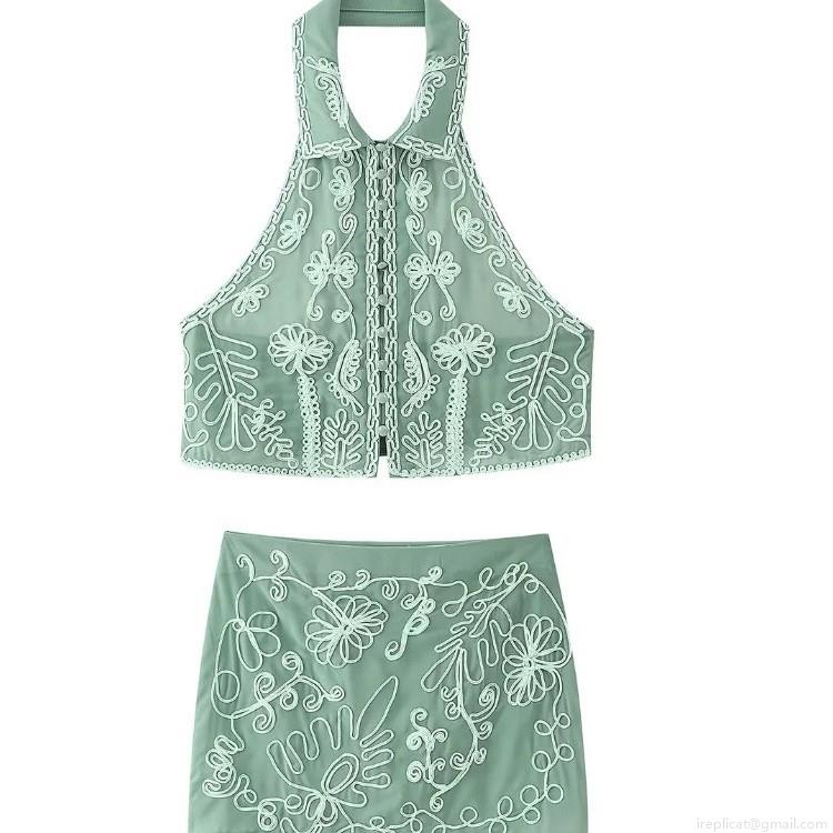 • Women's Sexy Halter Backless 2 Piece Skirt Set Floral Embroidery Lapel Sleeveless Top And Mini Skirt Vacation Outfits For Women