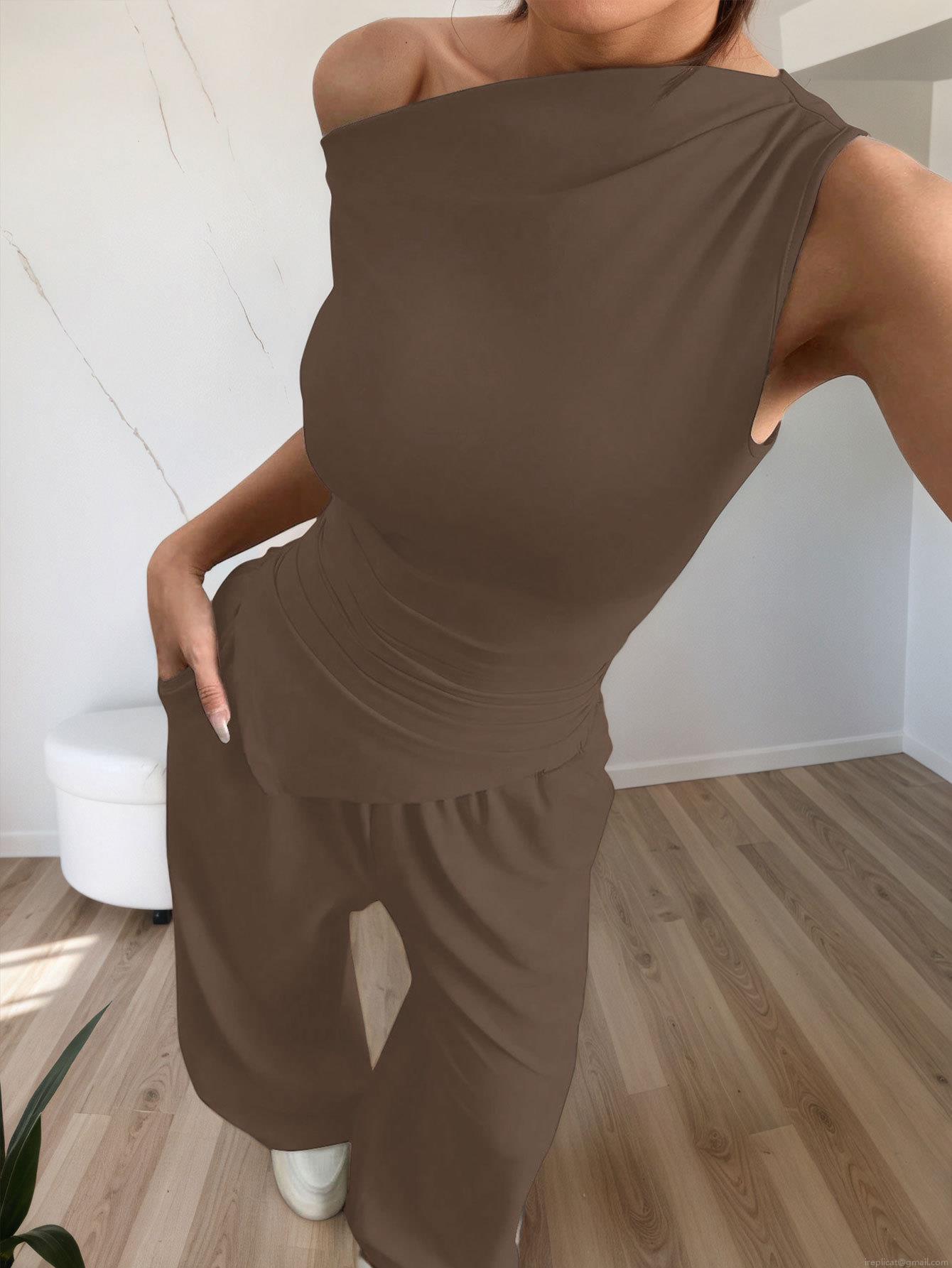 • Women's Sexy One Shoulder Sleeveless Top And High Waist Wide Leg Pants Two Piece Set Solid Color Summer Casual Outfit Fashion Lounge Set For Women