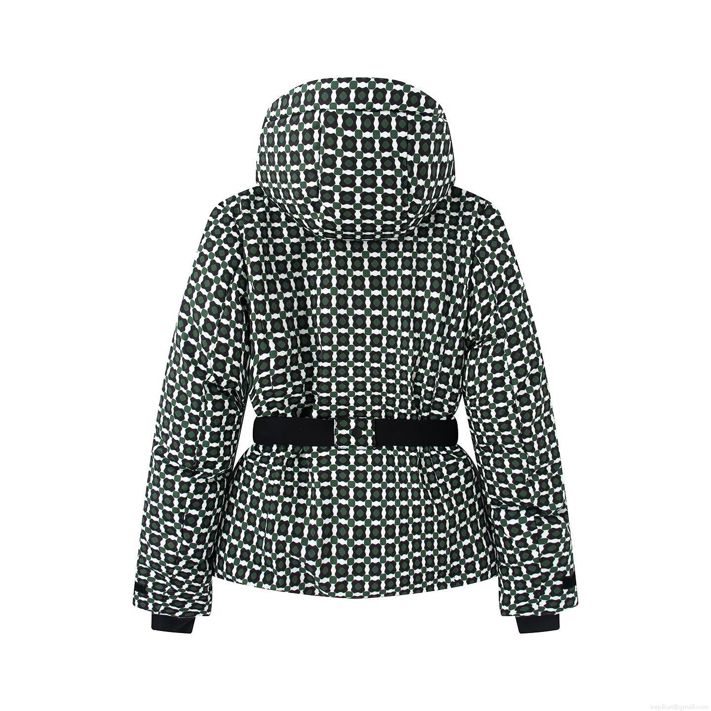 • Women's Ski Suit Set Green Geometric Checkered Hooded Padded Jacket And Pants With Belt Winter Outdoor Sport Warm Windproof Fashion Outfit