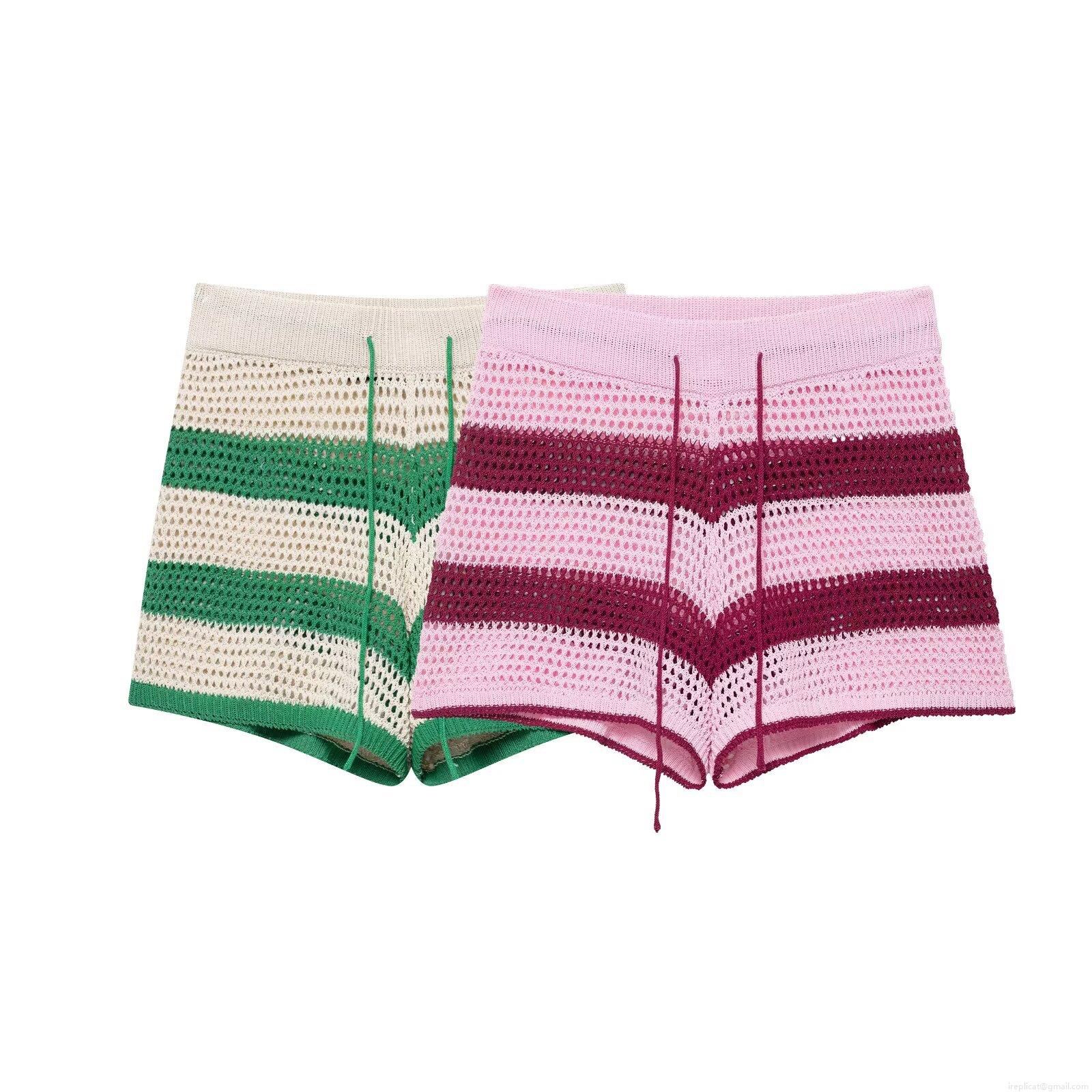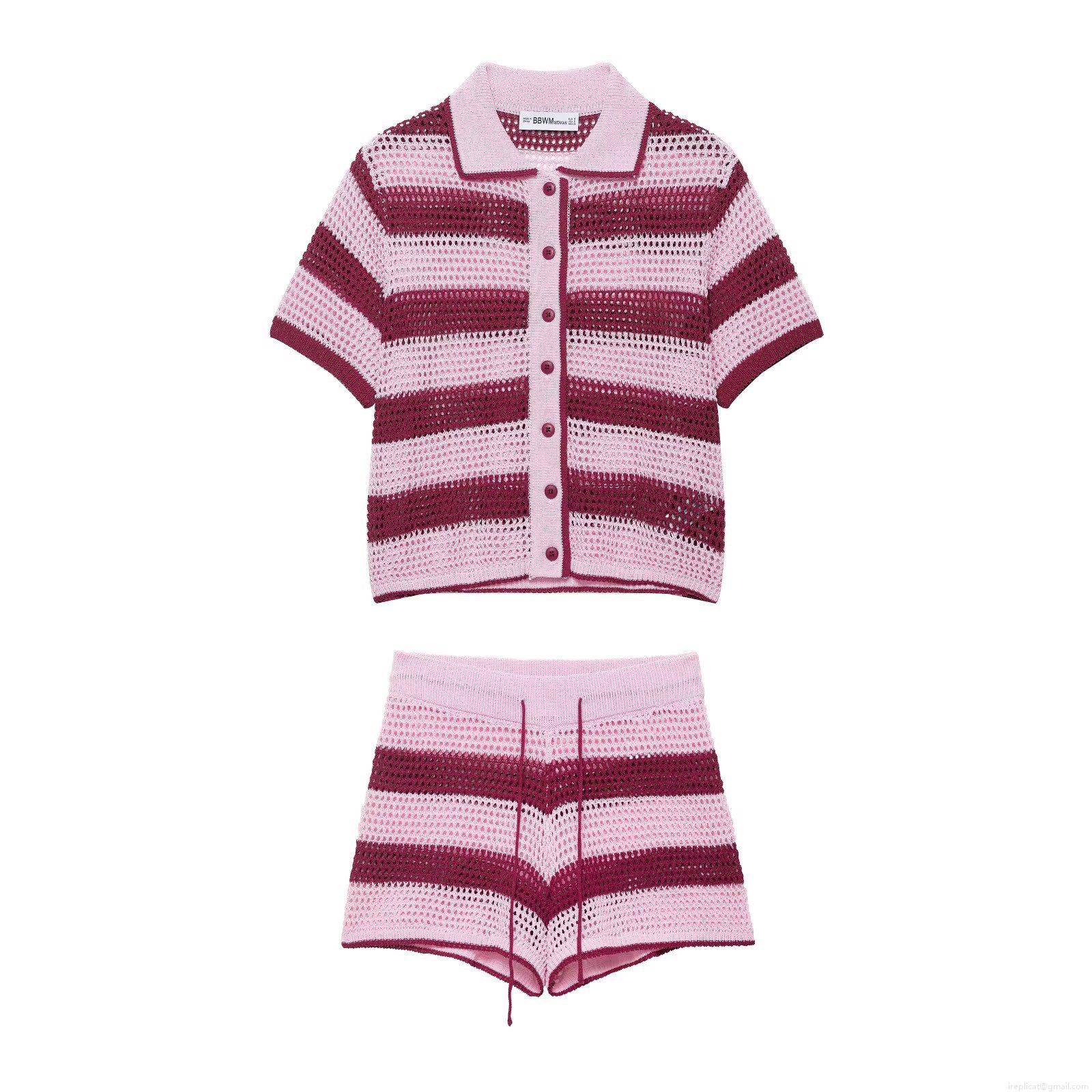 • Women's Striped Crochet Knit Polo Shirt and Drawstring Shorts Summer Casual Short Sleeve Knitted Top or Beach Shorts