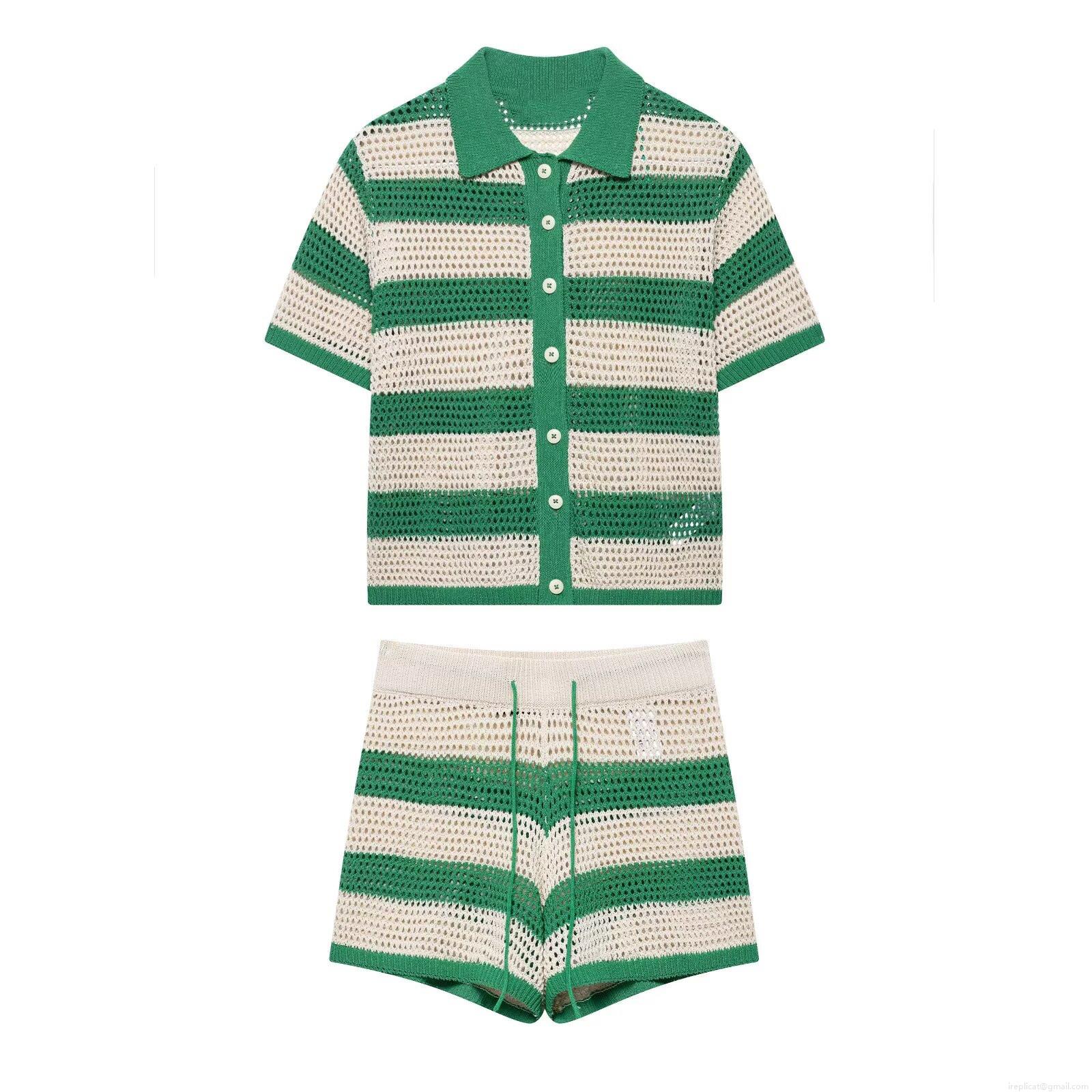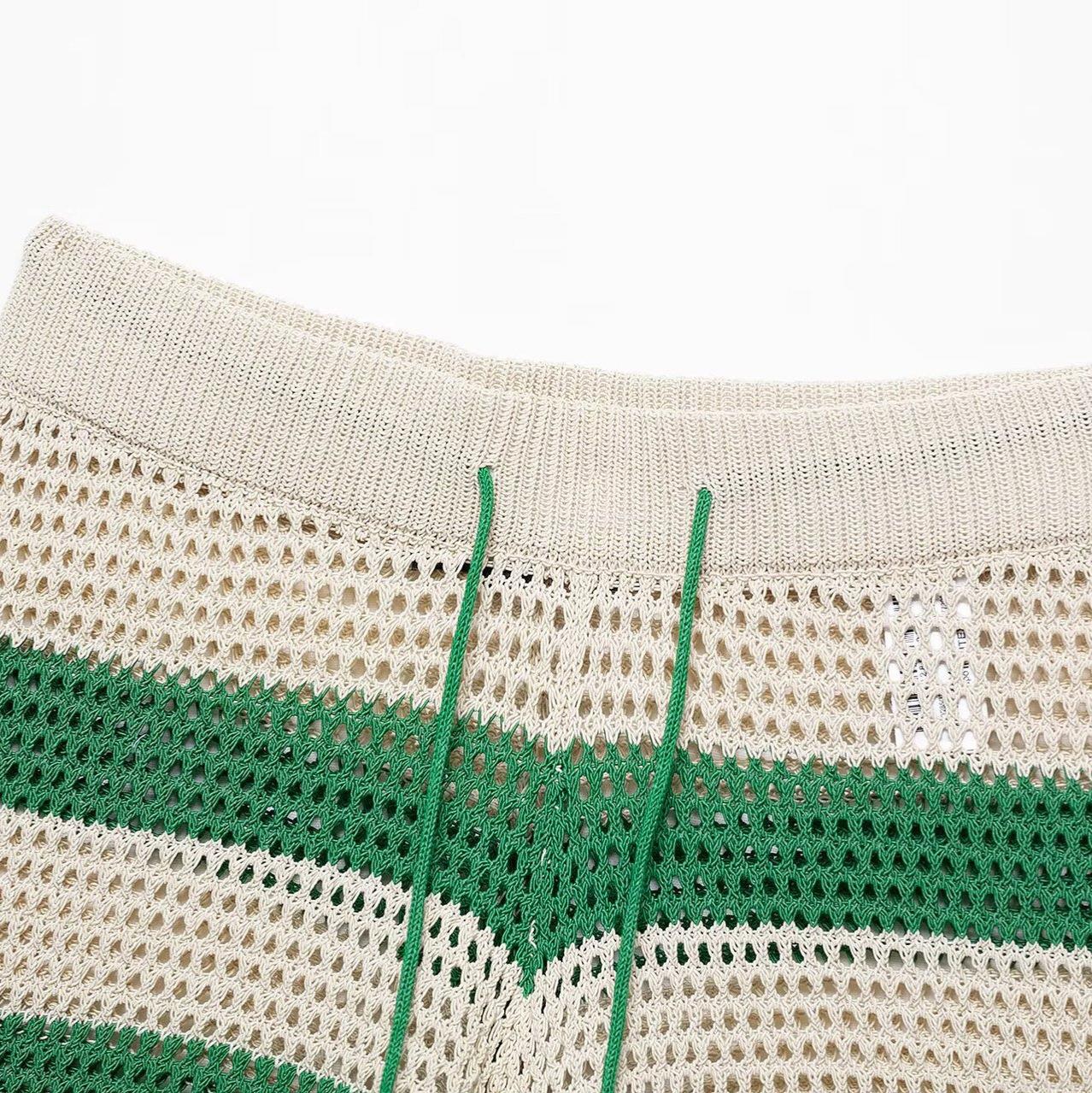 • Women's Summer Casual Knitted Striped Polo Shirt And Shorts Two Piece Set Hollow Out Crochet Short Sleeve Top Breathable Vacation Outfit