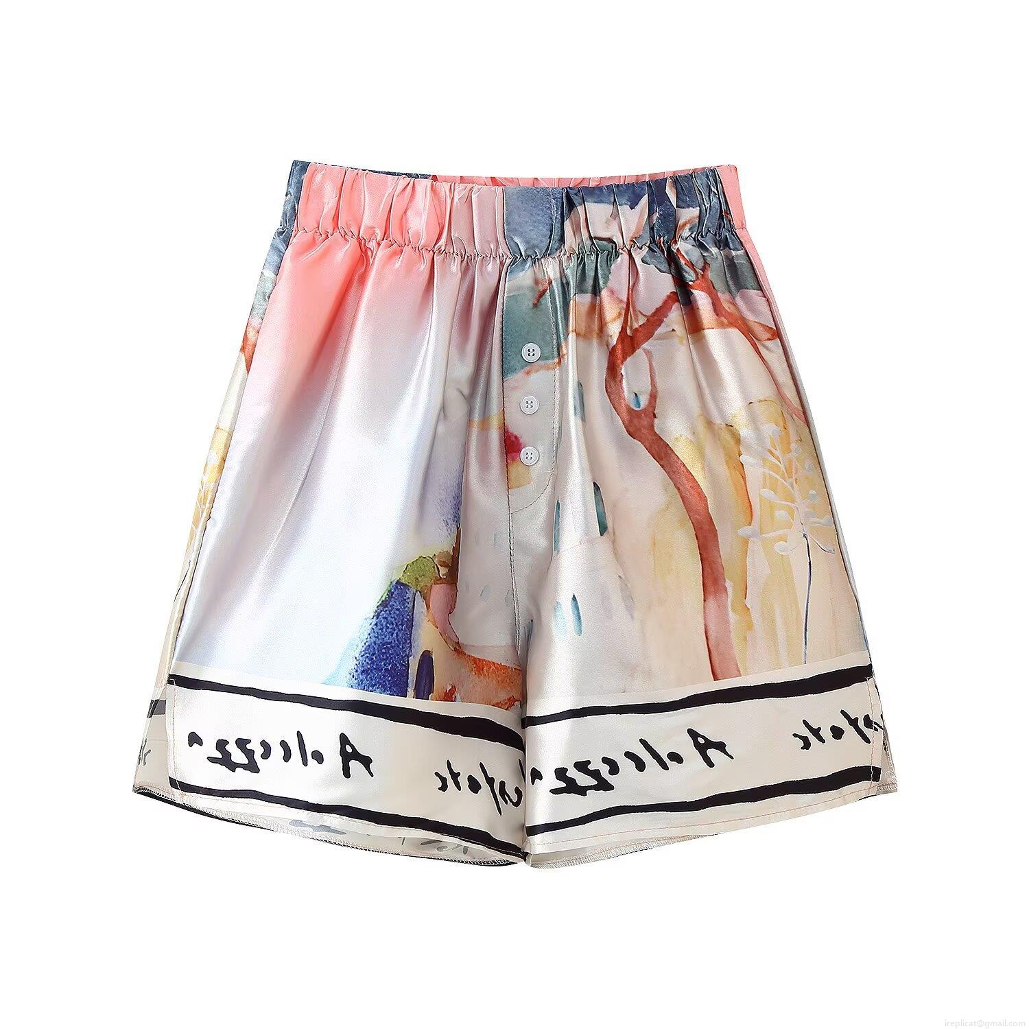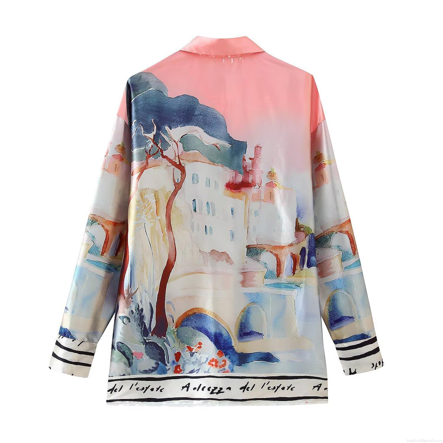 • Women's Two Piece Set Artistic Scenic Oil Painting Print Satin Polyester Shirt And Shorts Set Elegant Long Sleeve Lapel Top And Elastic Waist Shorts Vacation Outfit