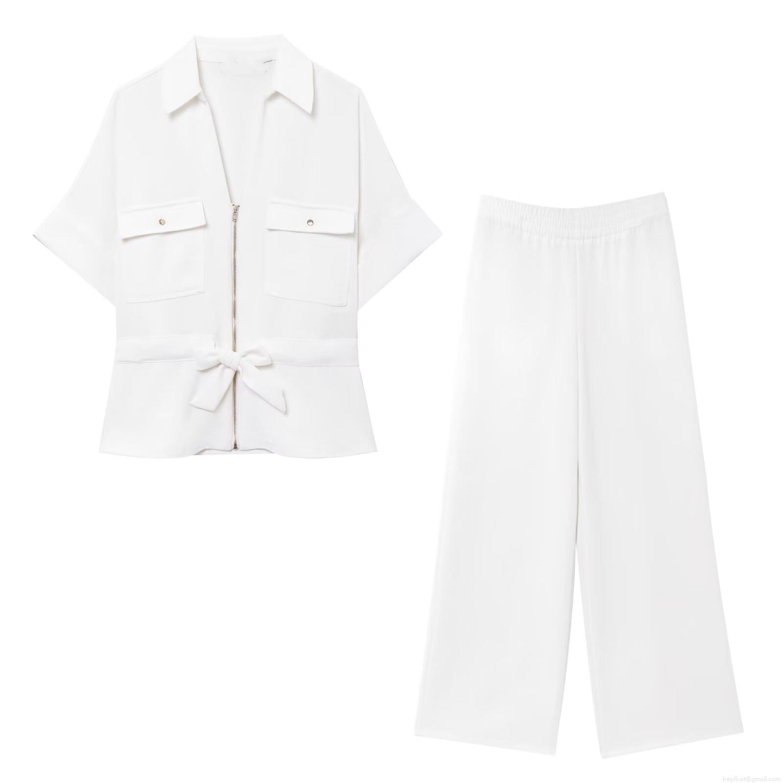 • Women's Two Piece Set Short Sleeve Zipper Shirt and Wide Leg Pants With Bow Belt Casual Office Solid Color Crepe Fabric Outfit Trousers Suits For Ladies