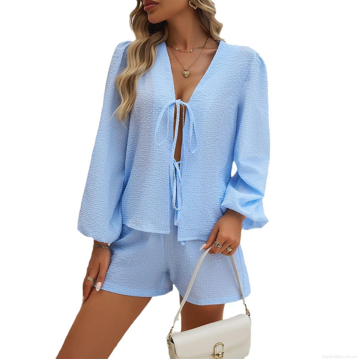 • Women's Two Piece Shorts Set Crinkled Polyester V-Neck Tie-Front Long Sleeve Puff Sleeve Top And High Waist Shorts Casual Vacation Leisure Streetwear For Women