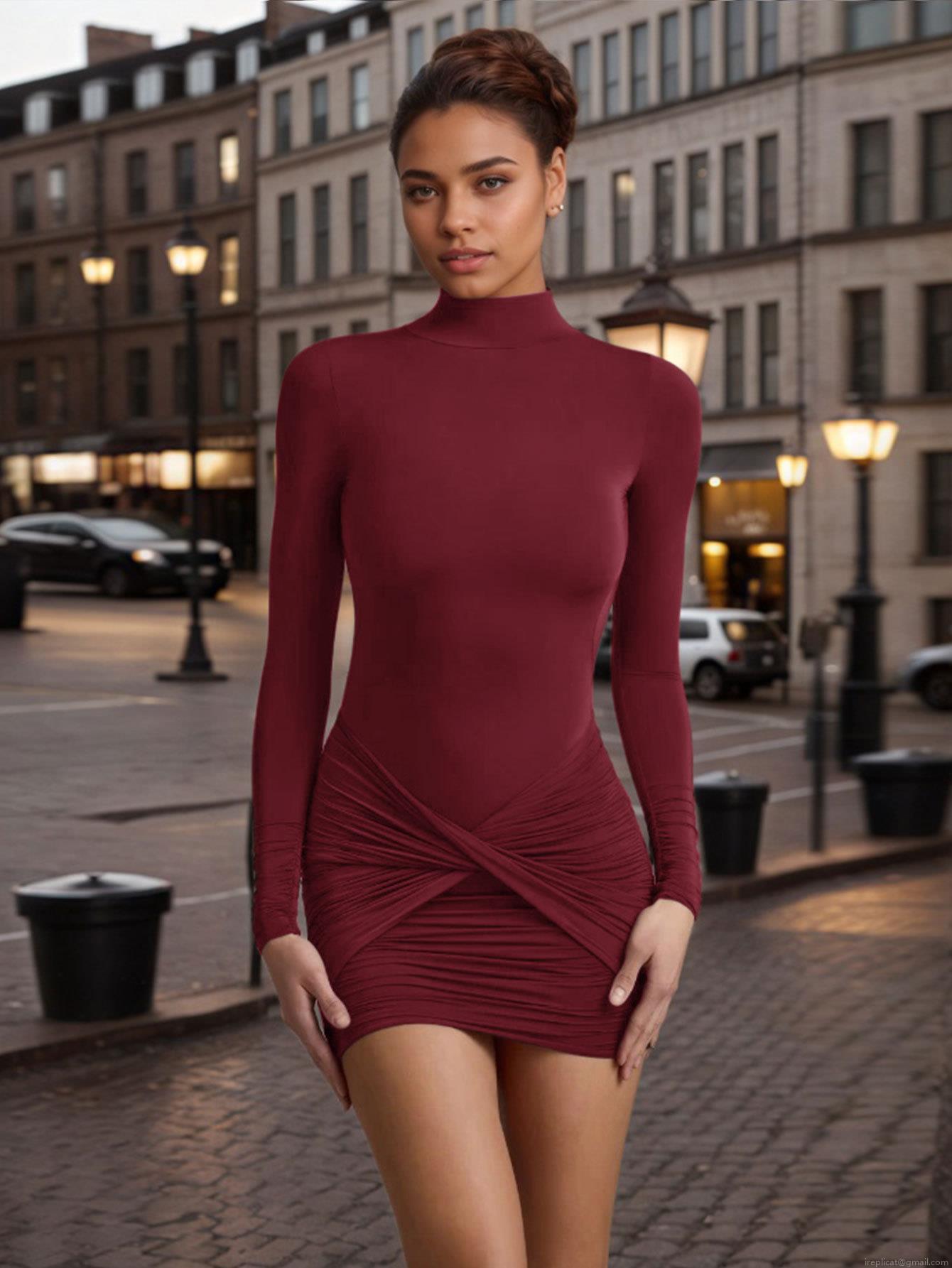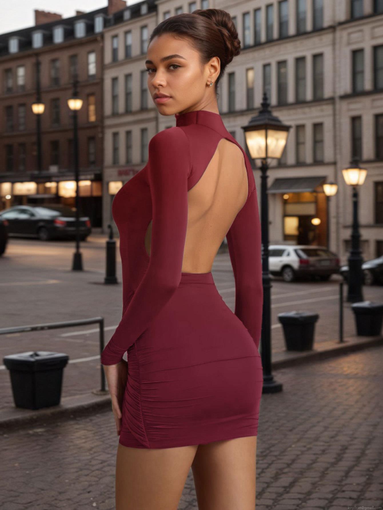 • Women's Sexy Backless Bodycon Mini Dress Long Sleeve Mock Neck Ruched Knit Cocktail Party Night Club Slim Fit Dress Burgundy