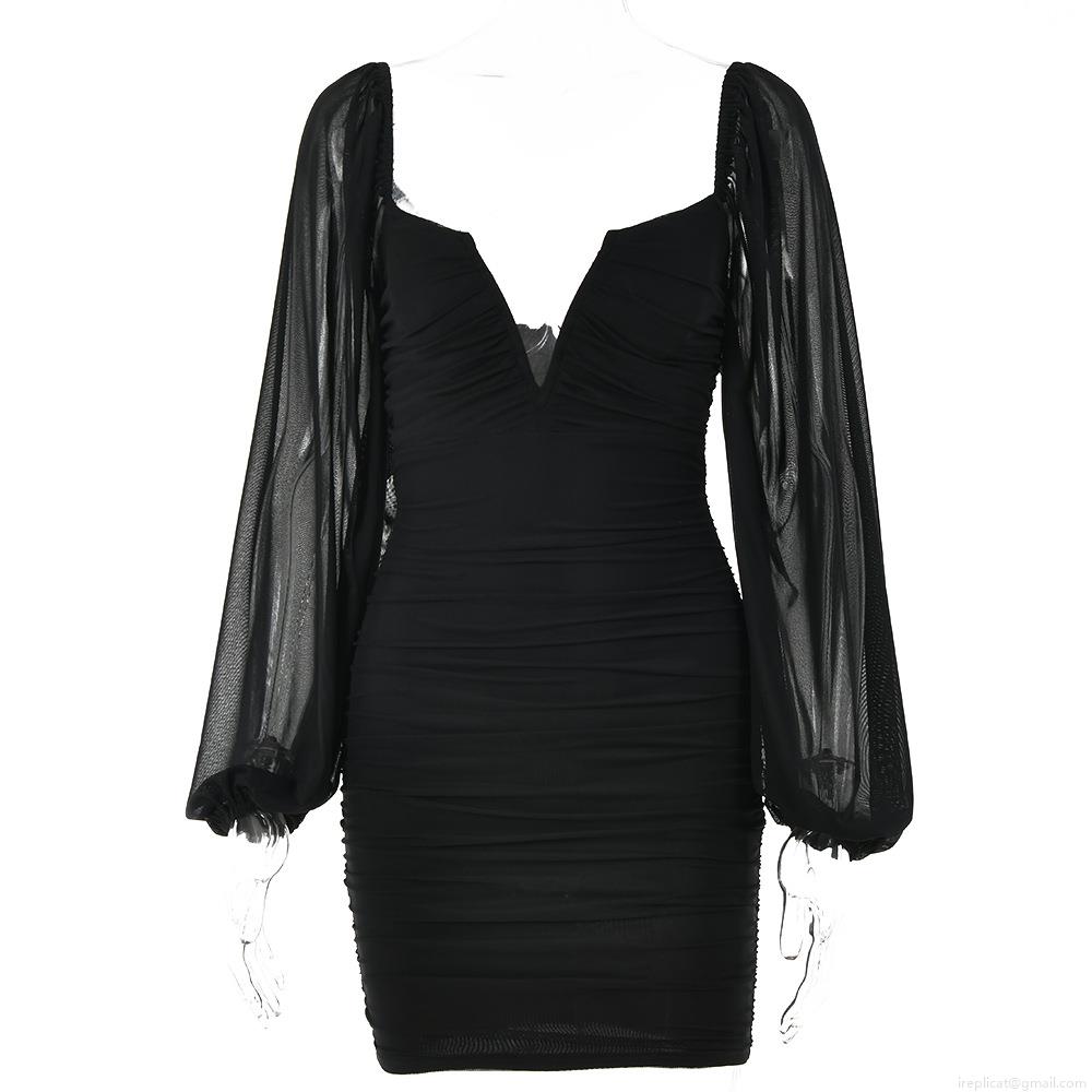 • Women's Sexy Deep V-Neck Backless Ruched Bodycon Mini Dress Mesh Long Puff Sleeve Lantern Sleeve Clubwear Party Evening Tight Dress