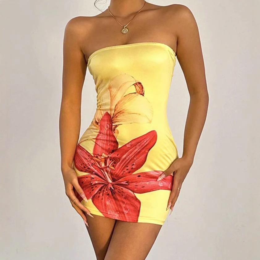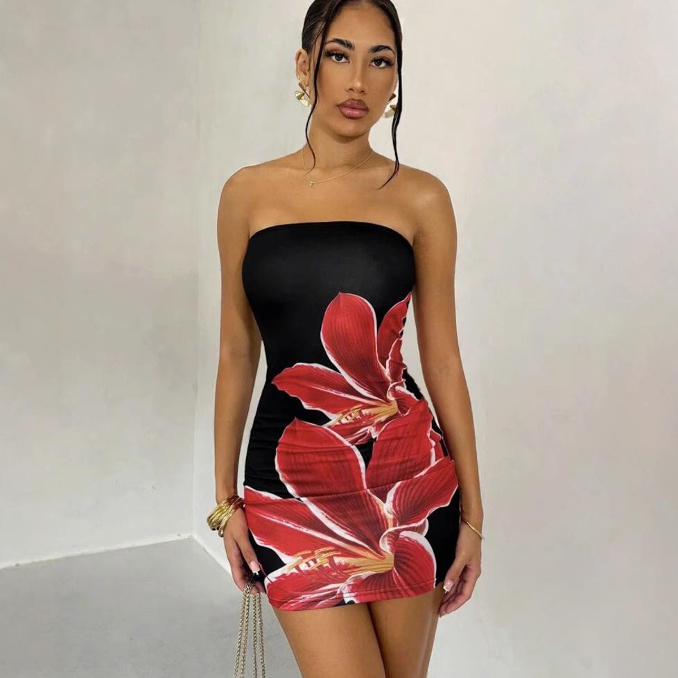 • Women's Sexy Floral Print Tube Top Bodycon Mini Dress Strapless Ruched Slim Fit Sleeveless Sun Dress For Party Vacation Summer