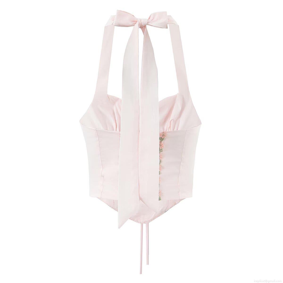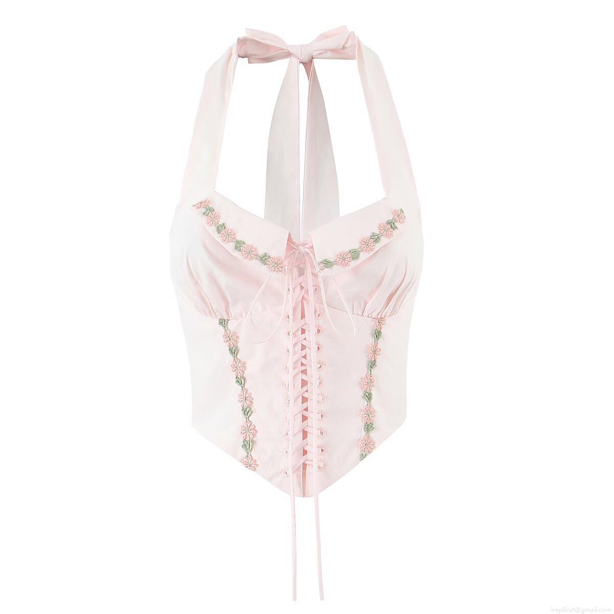 • Women's Sexy Halter Corset Top With Floral Embroidery Vintage Lace Up Backless Crop Top Sleeveless Nylon Elastane Camisole For Summer Streetwear